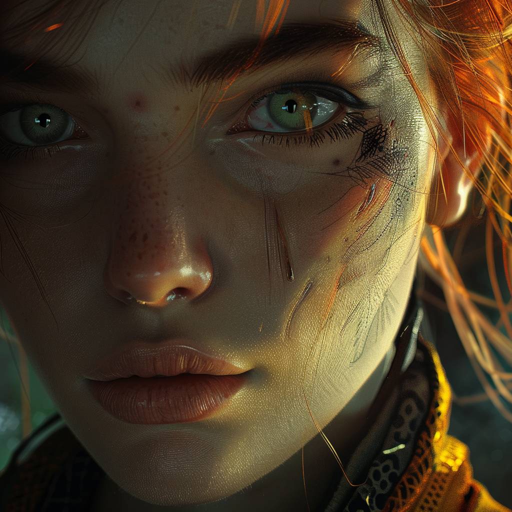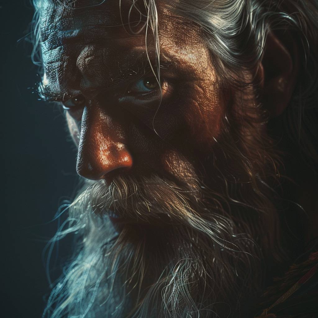 Dramatic portrait of a fantasy character with shadowed lighting.