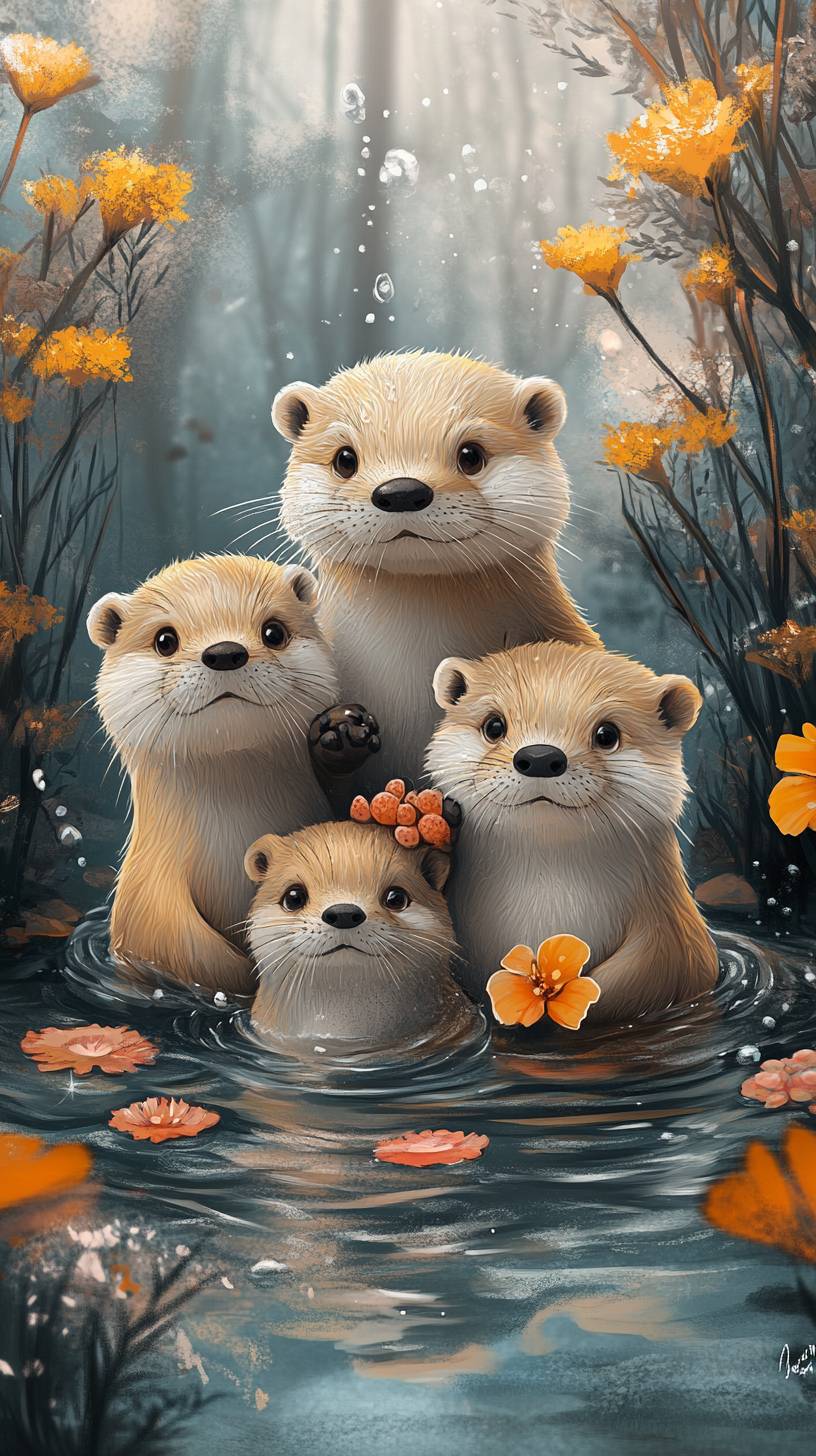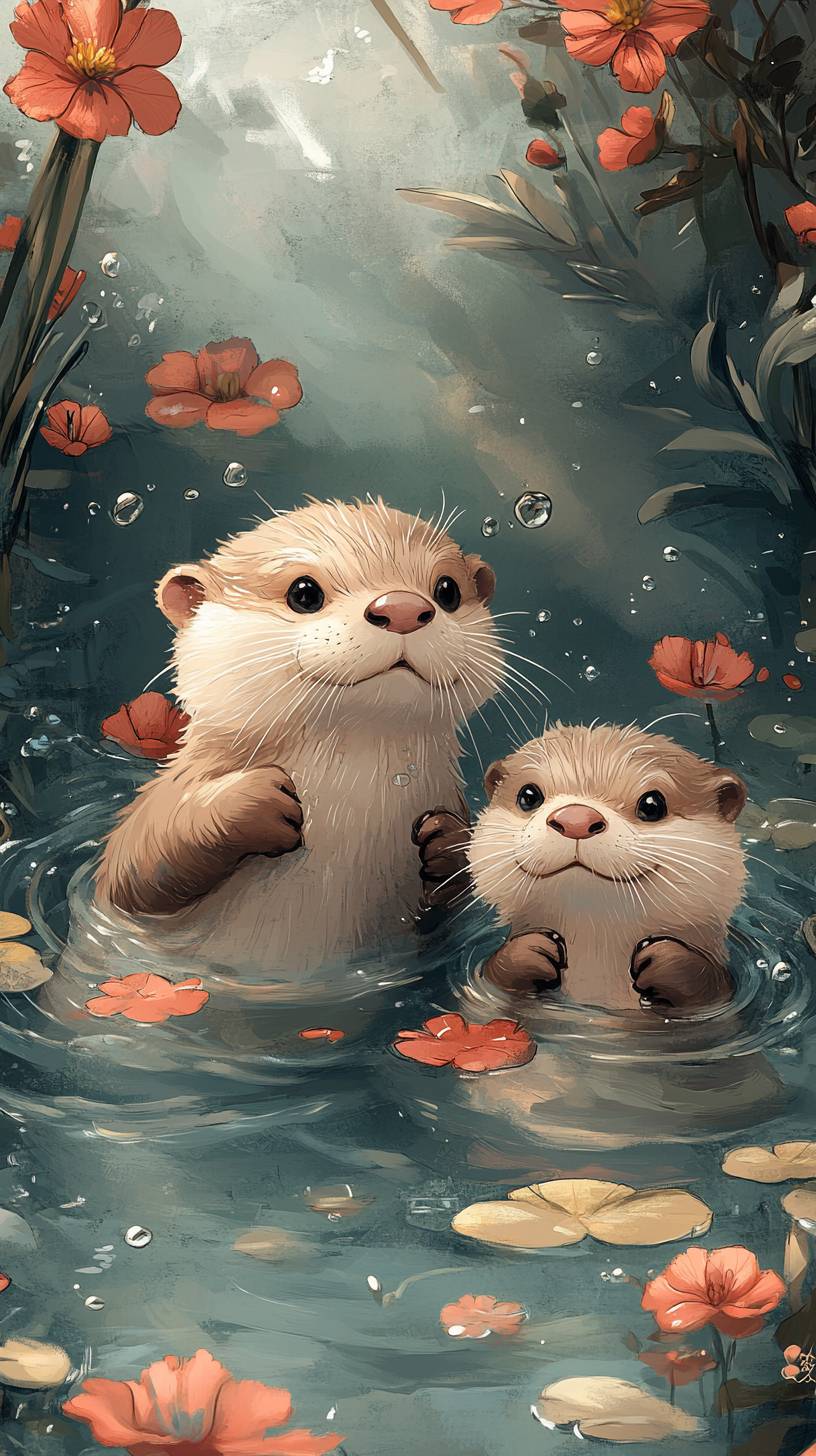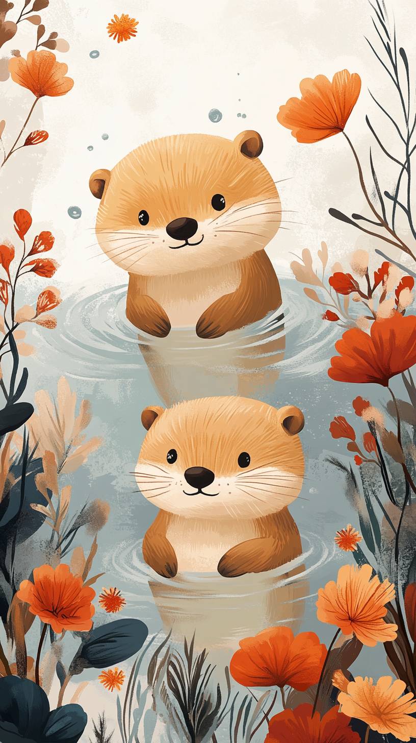Cute cartoon otters swimming in light blue water, whimsical style with nature-inspired elements.
