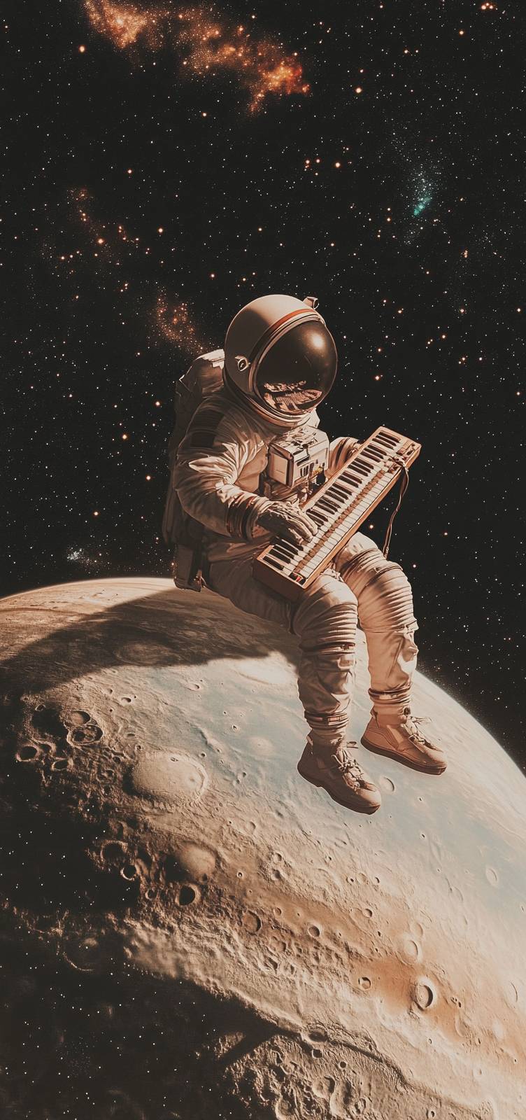 A cinematic photograph of an astronaut playing KORG keyboards sitting on top of the planet Saturn, with a black space background featuring stars and galaxies, in a vintage, retro aesthetic, vide angle --ar 8:17 --v 6.1