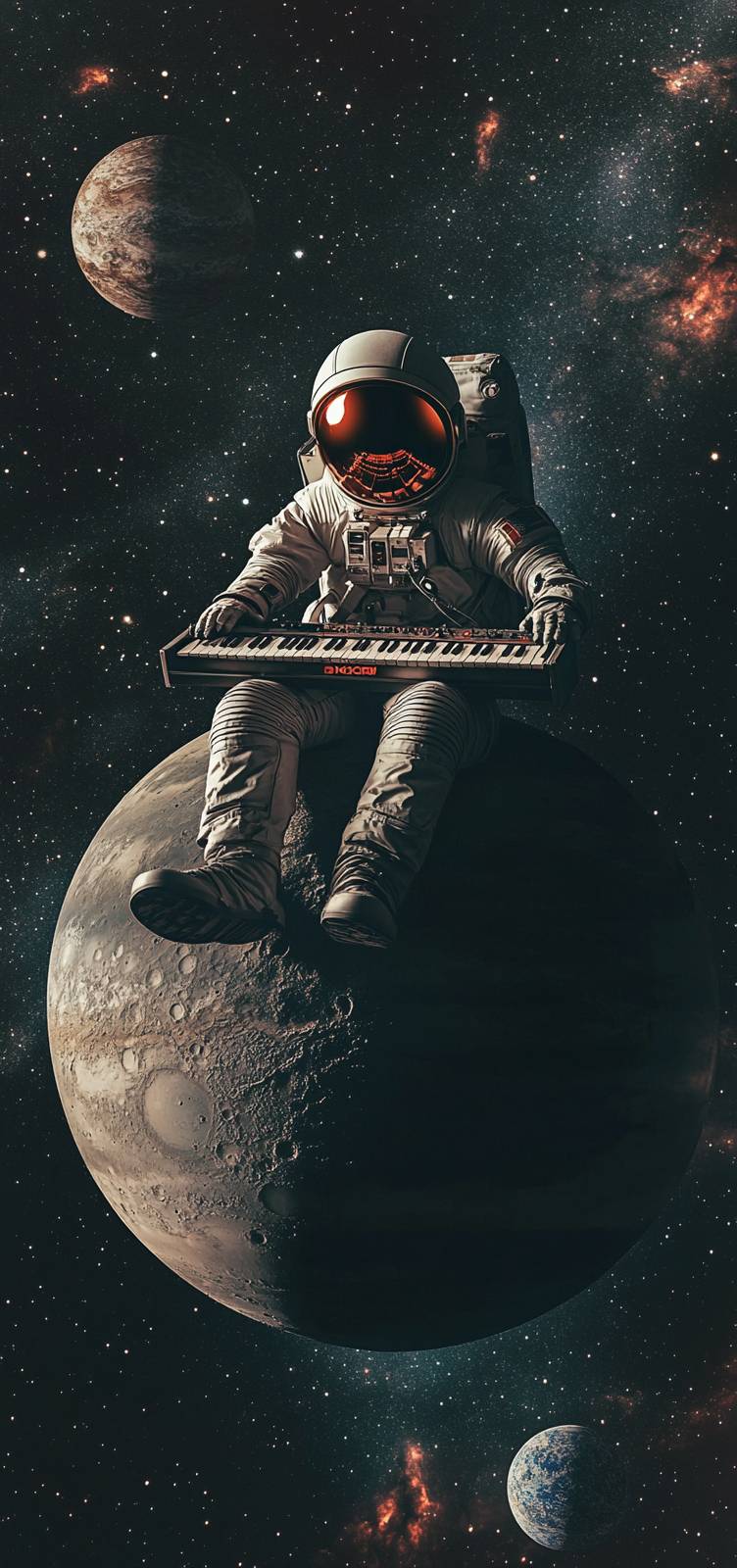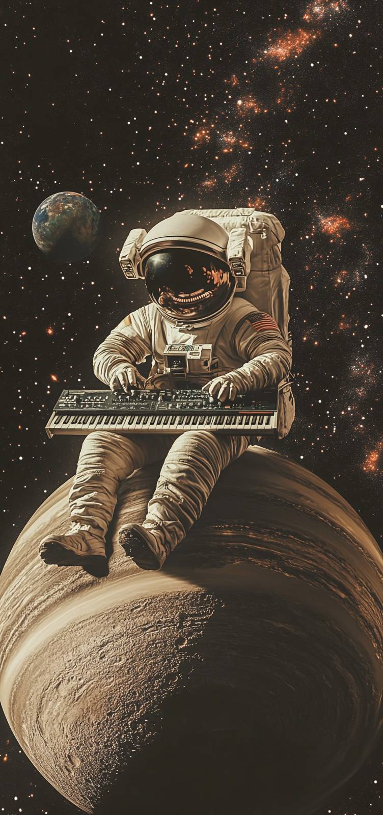 An astronaut plays KORG keyboards on Saturn with a black space background of stars and galaxies.