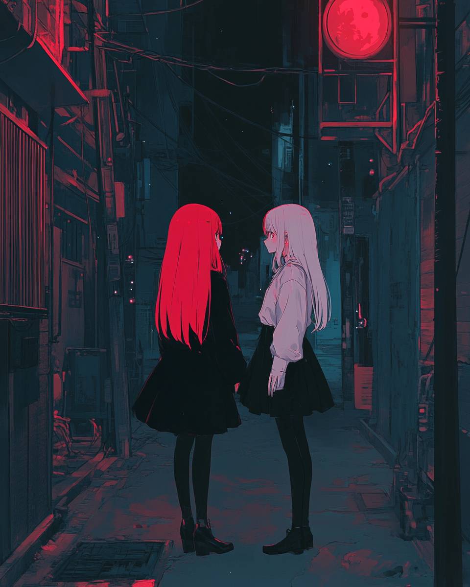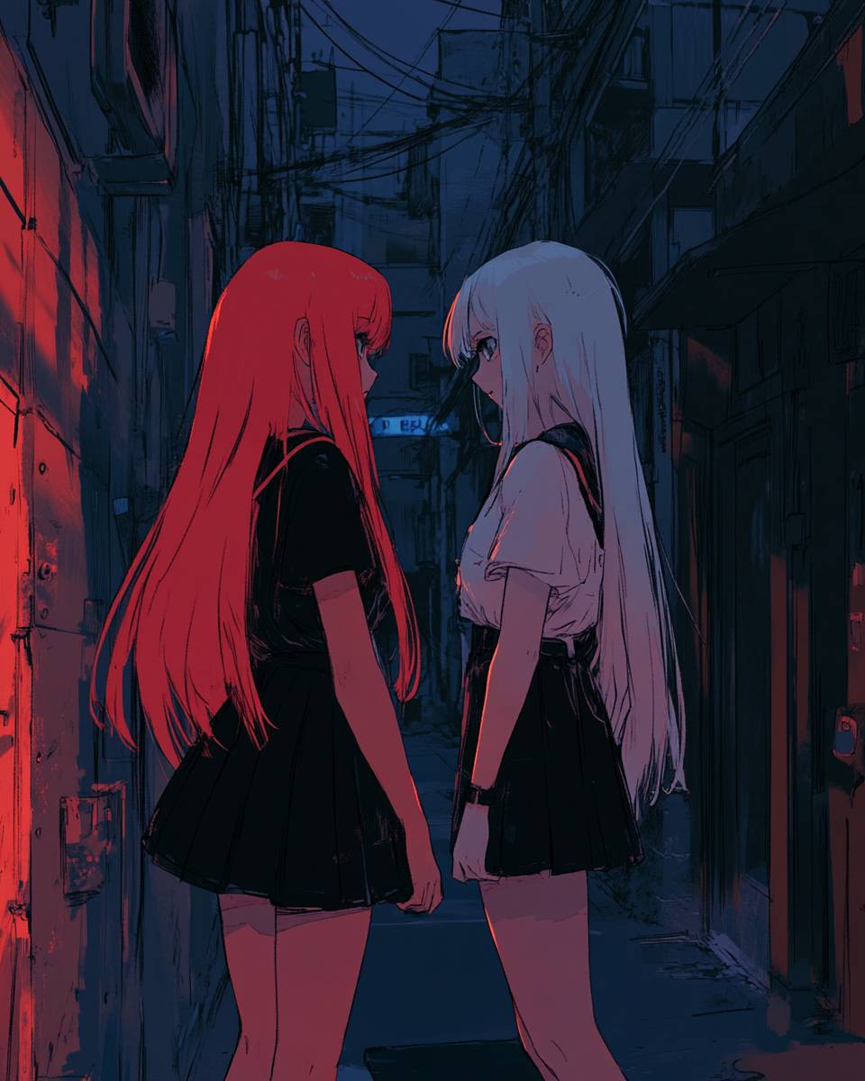 anime art style, red hair girl and white hair girl in a dark alley, Makima eyes, dark, manga art, bold lines --ar 4:5 --profile x8ttvbx --v 6.1