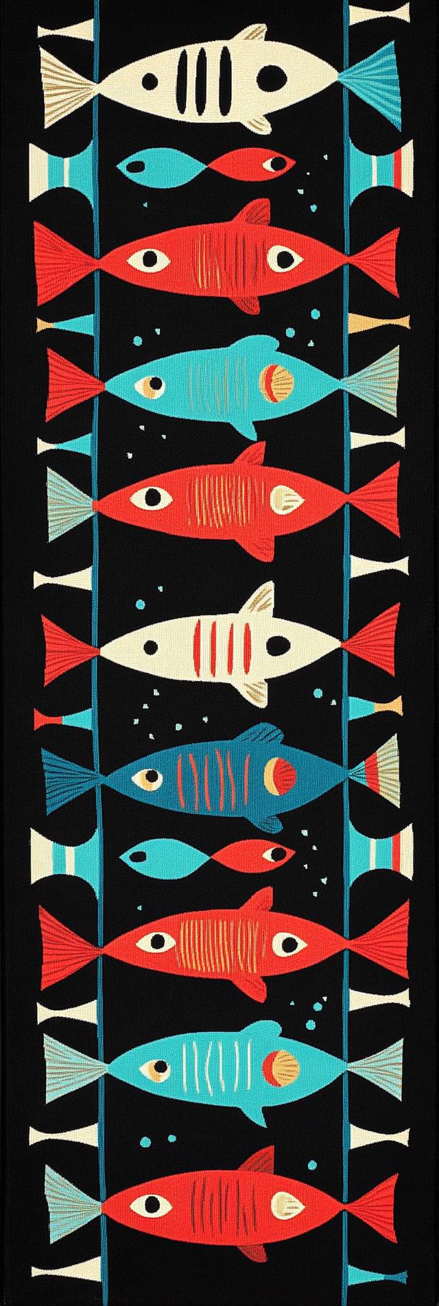 Colorful fish pattern table runner with bold stripes in red, black, teal, and blue, symmetrical layout in 1:3 aspect ratio, designed for vibrant and artistic table settings. High-definition details, perfect for casual dining decor. --ar 1:3 --iw 2 --v 6.1