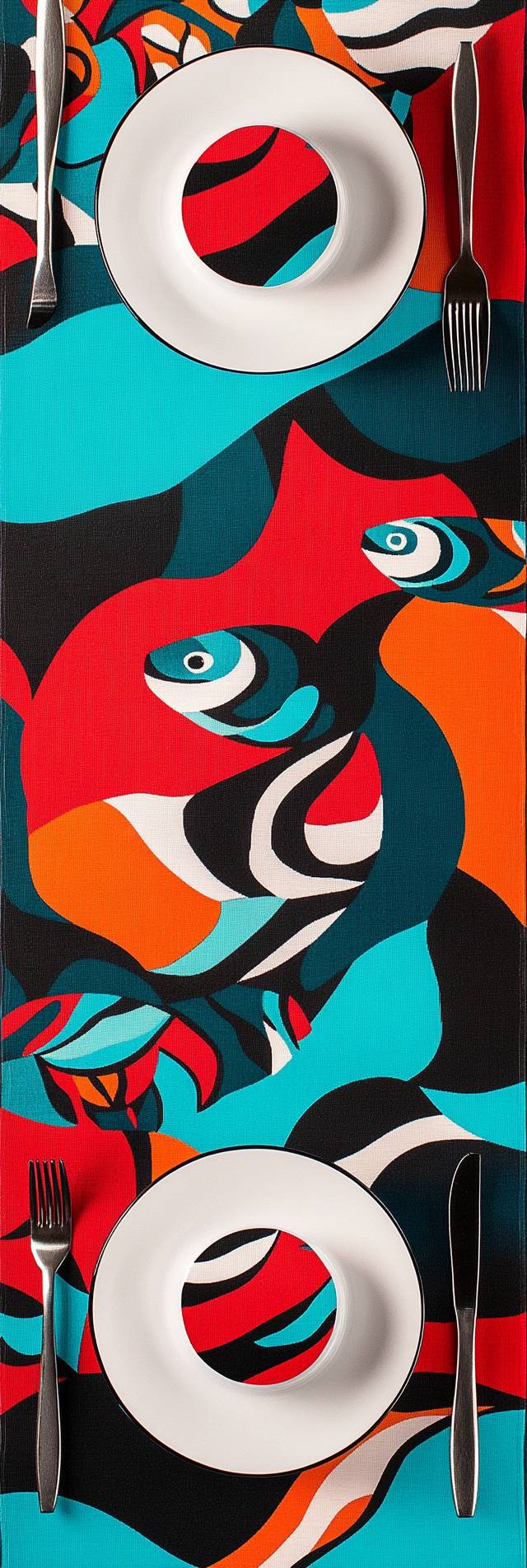 Colorful fish pattern table runner with bold stripes in red, black, teal, and blue, symmetrical layout in 1:3 aspect ratio, designed for vibrant and artistic table settings. High-definition details, perfect for casual dining decor.