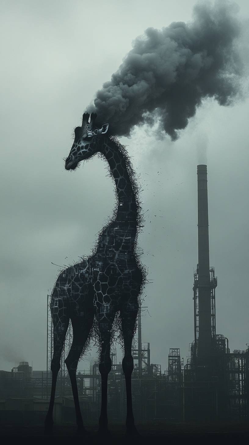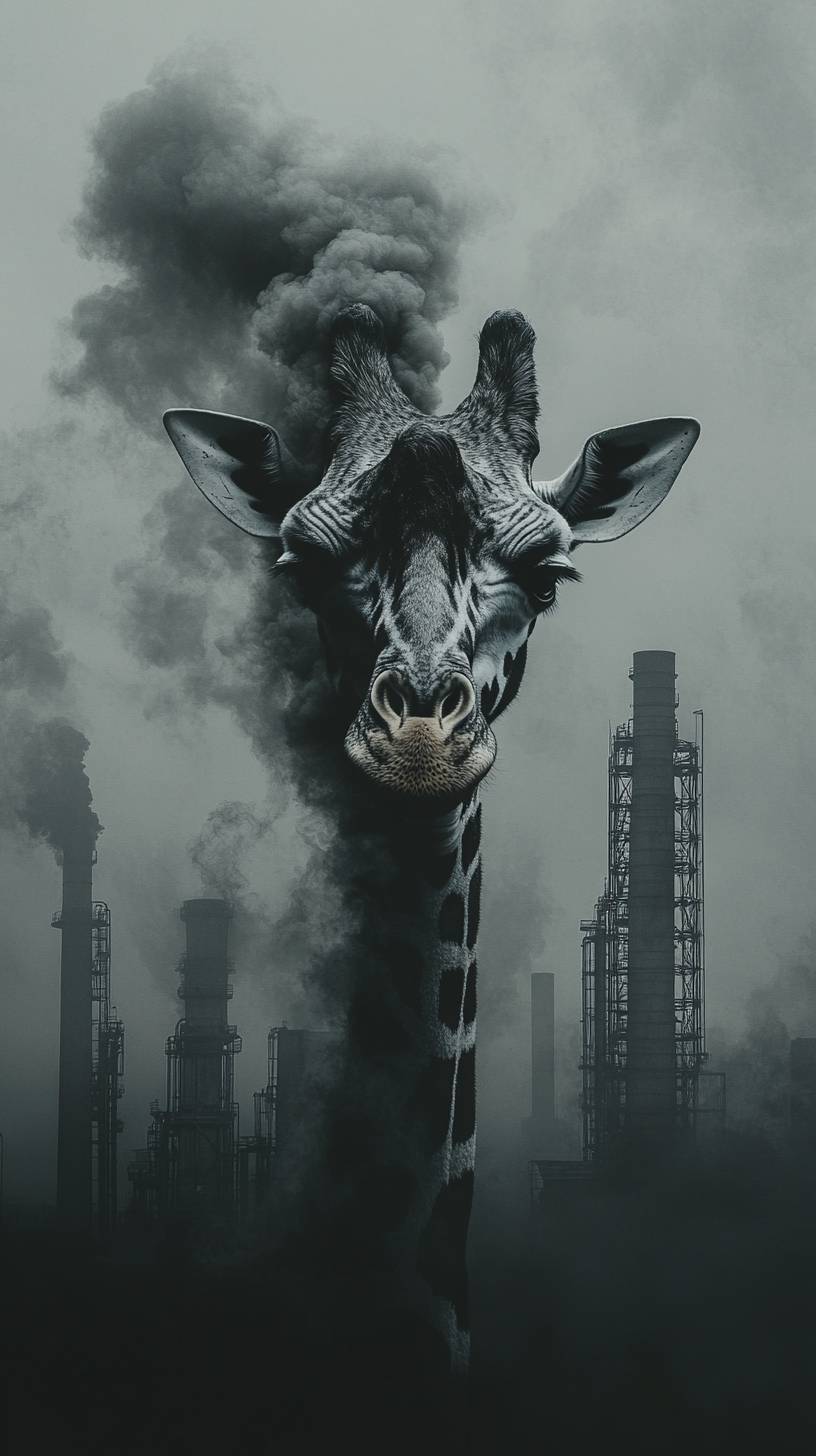 This image shows smoke from an industrial chimney forming the shape of a giraffe with a factory in the background. By combining the smoke with the image of a giraffe, the impact of environmental pollution on wildlife is conveyed and the seriousness of air pollution is emphasized. --ar 9:16 --stylize 400 --v 6.1