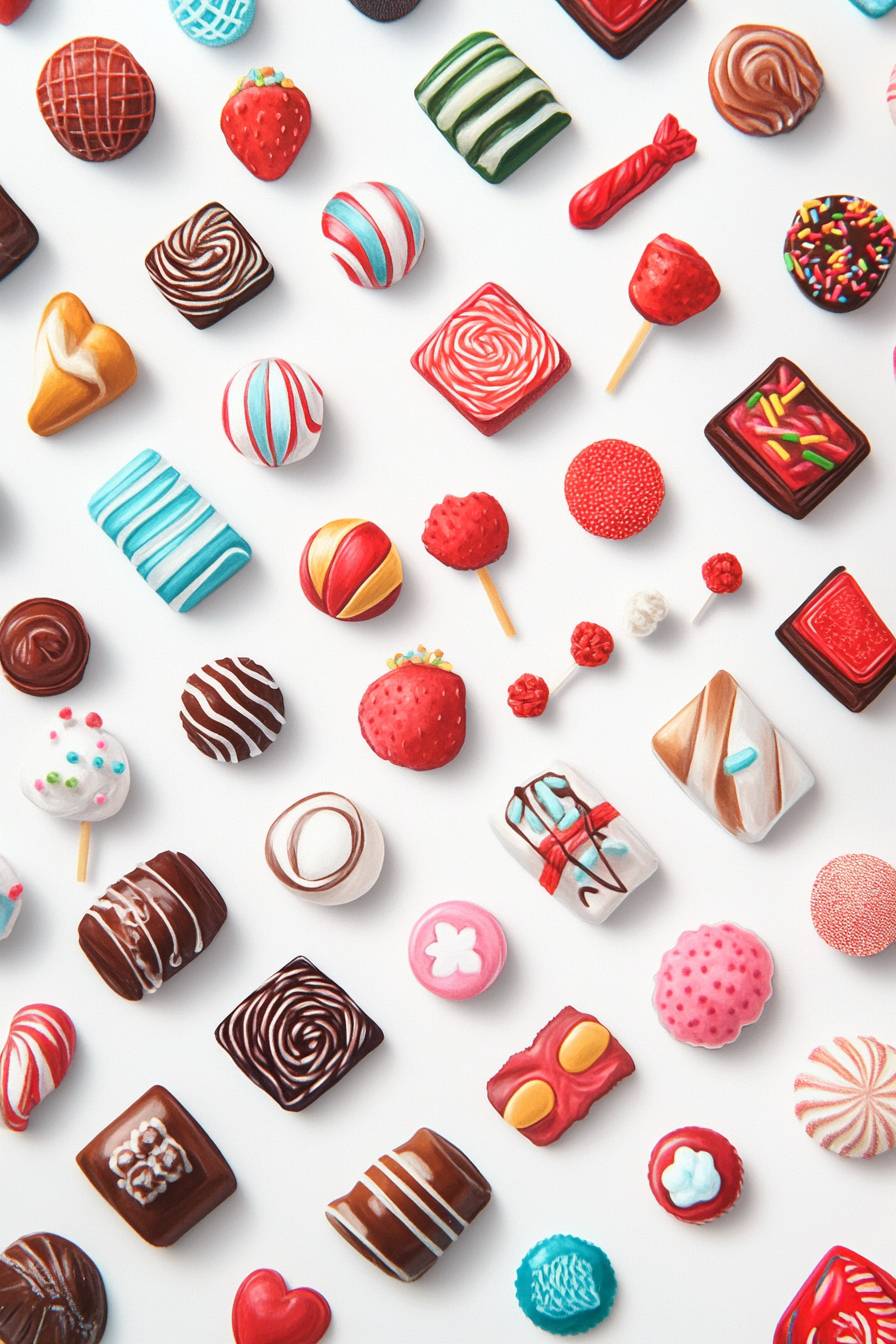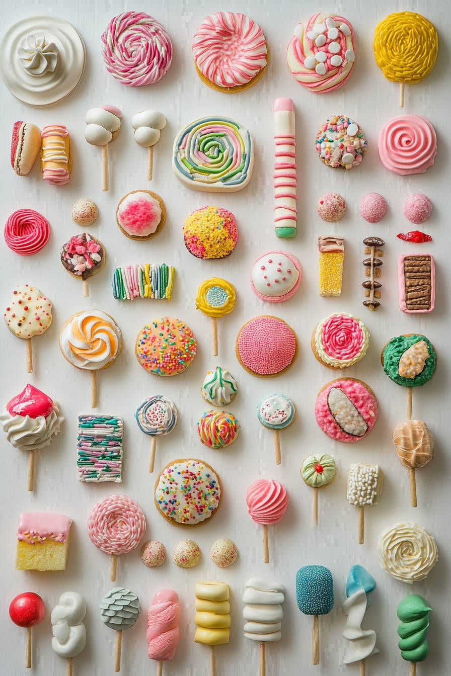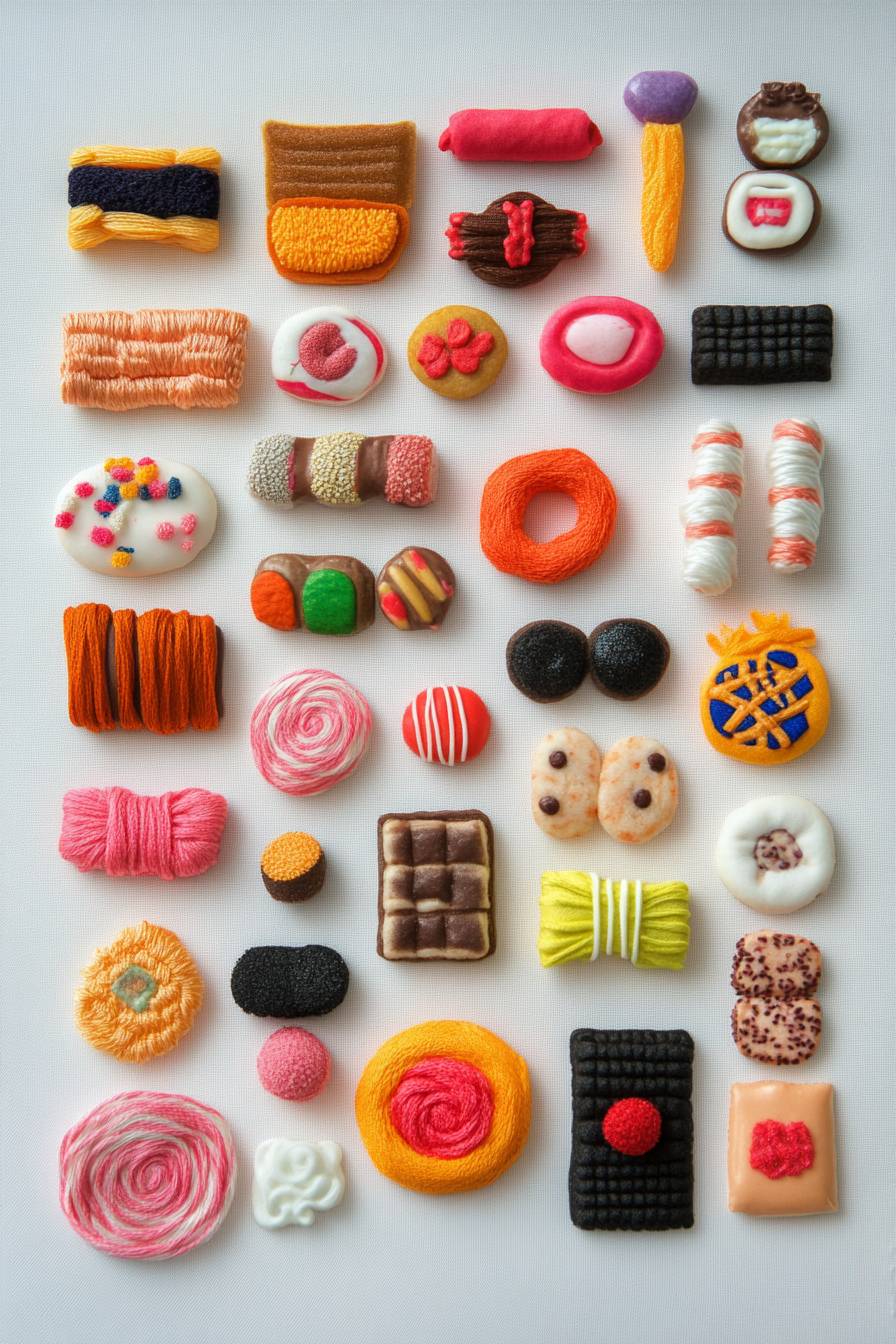 Sticker style sheet, neatly arranged, wide variety, stylish embroidered sweets, white background.