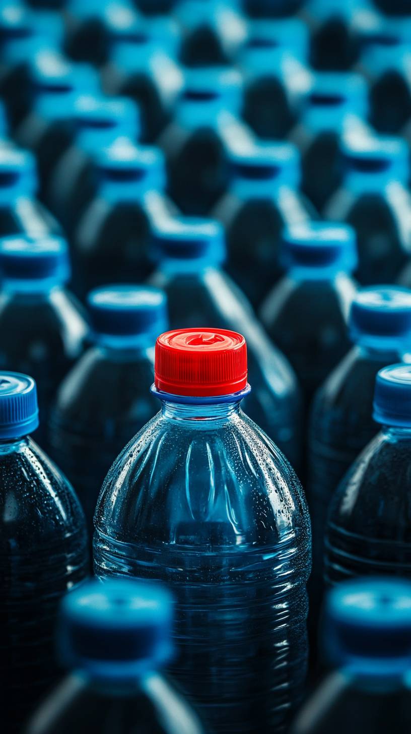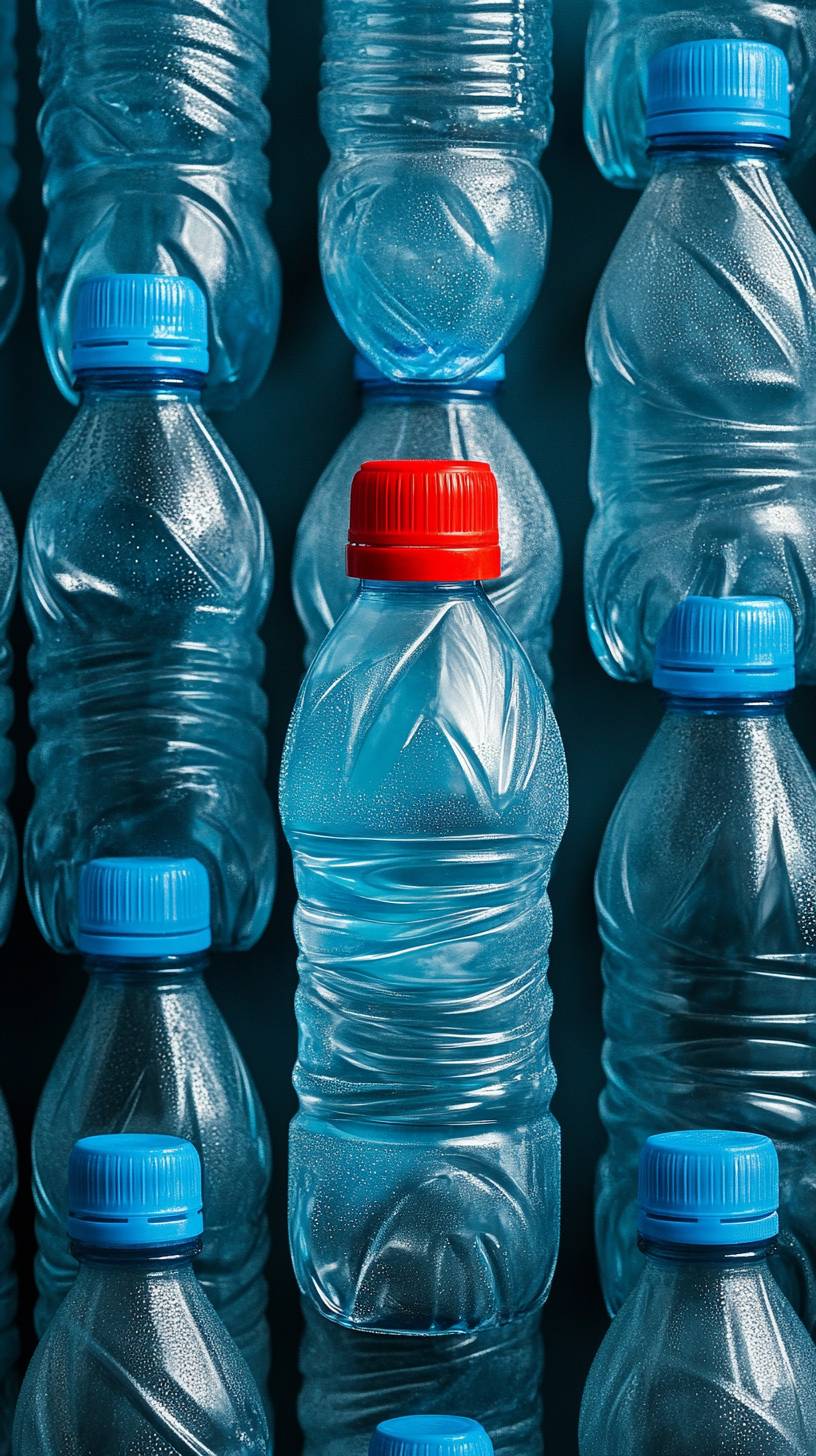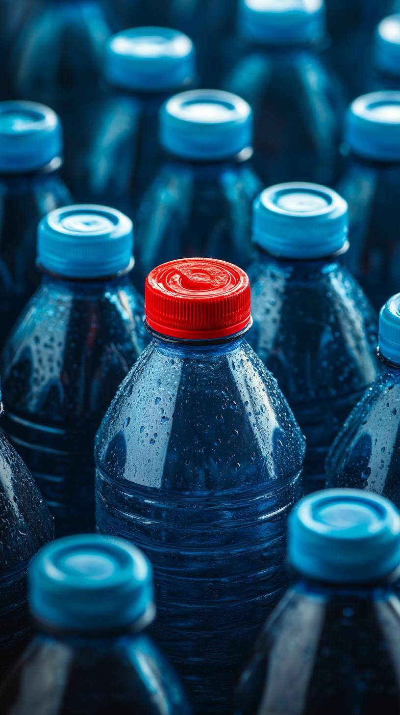 Artistic arrangement of identical water bottles, one bottle with a bright red cap standing out among blue caps, symbolic uniqueness concept --ar 9:16 --v 6.1