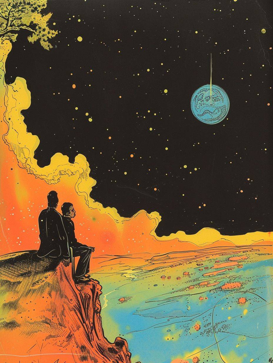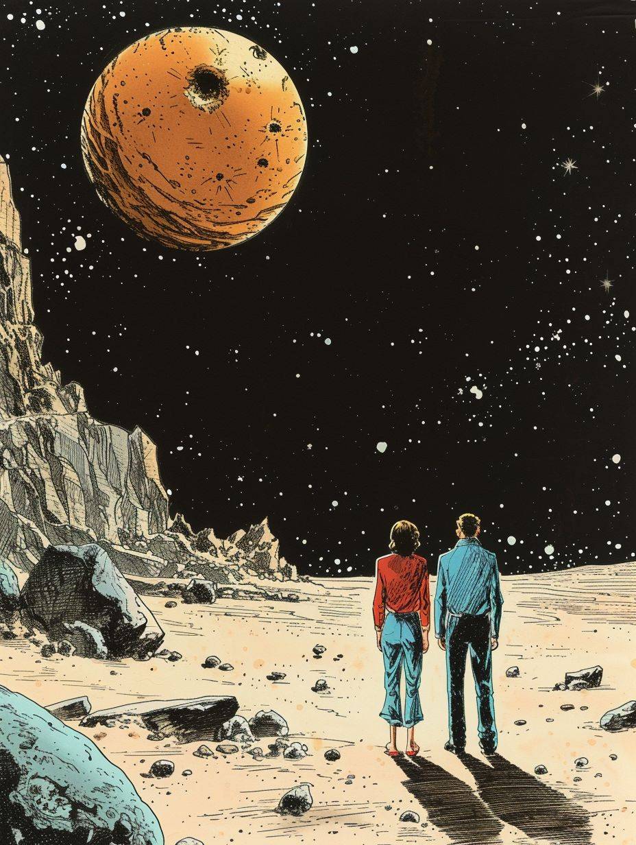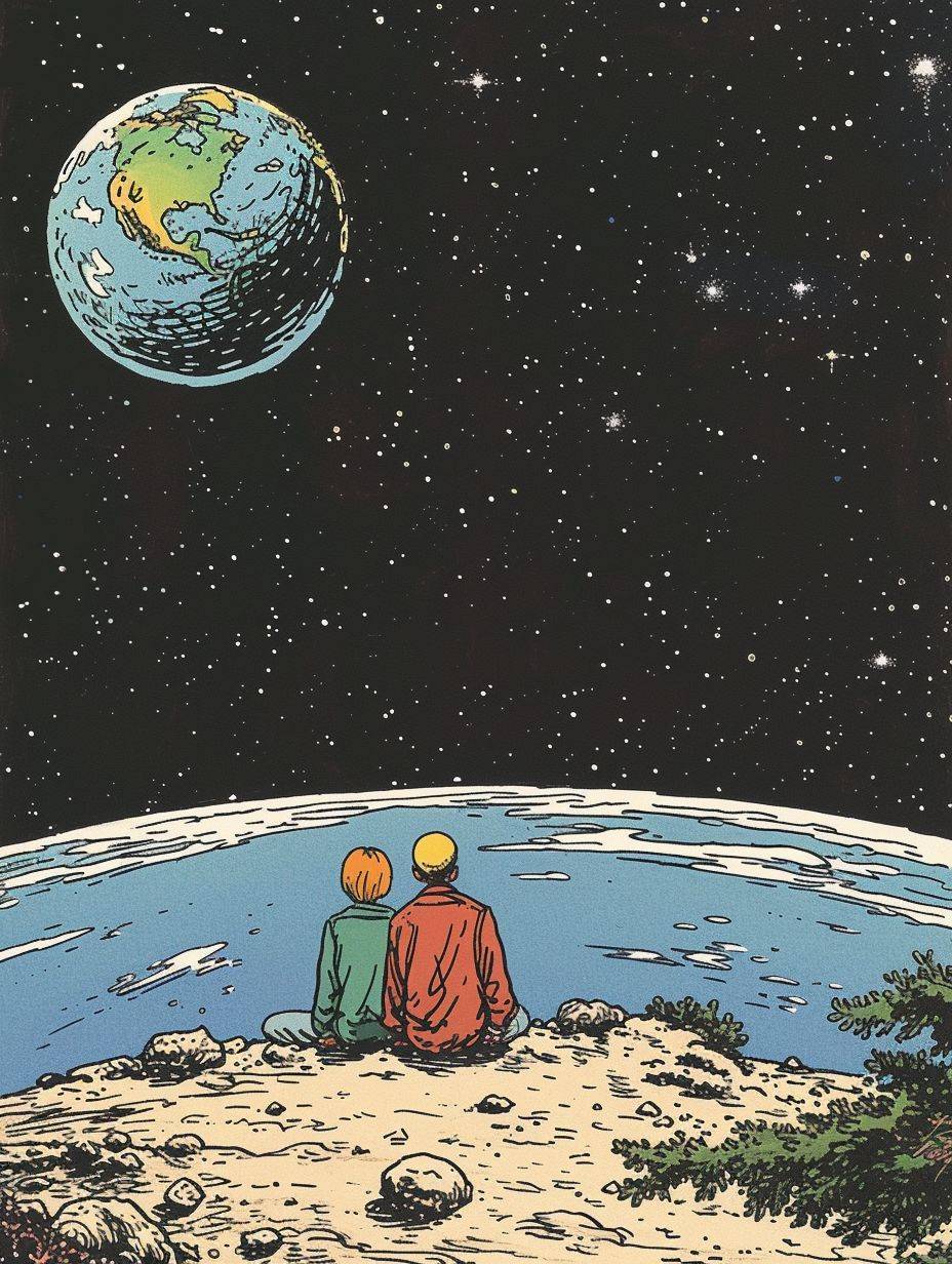 The background features space and Earth, depicting a sad man and a happy woman.