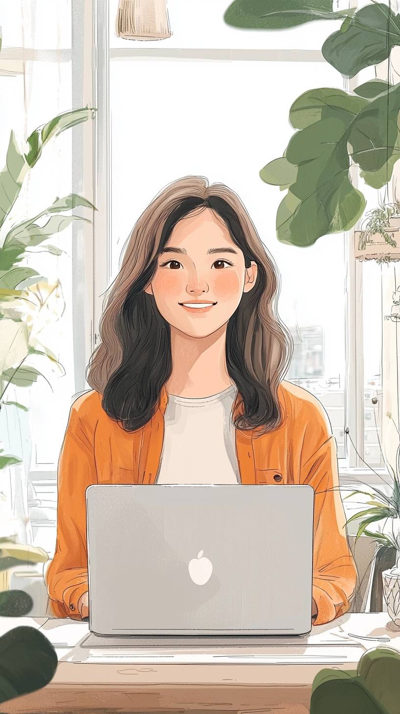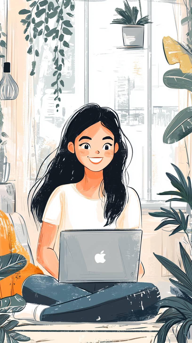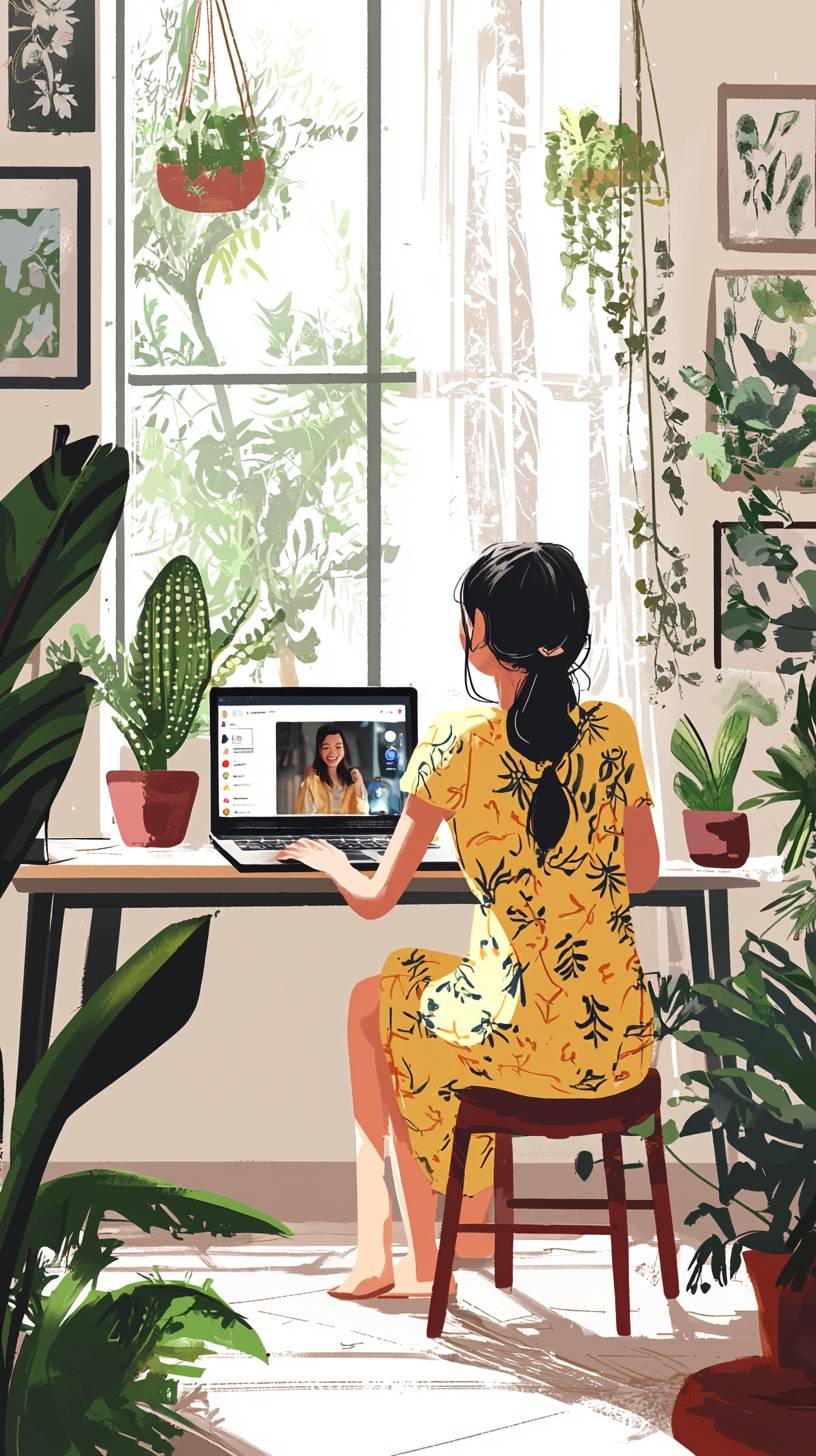 Chinese woman, hand-drawn style, video calling with friends on a laptop, modern apartment interior with cozy furniture and plants, clean white background, detailed laptop screen with video call interface, muted colors, casual clothing, happy expression, intricate design on laptop case, --chaos 10 --ar 9:16 --quality 2 --style raw --stylize 200 --v 6.1