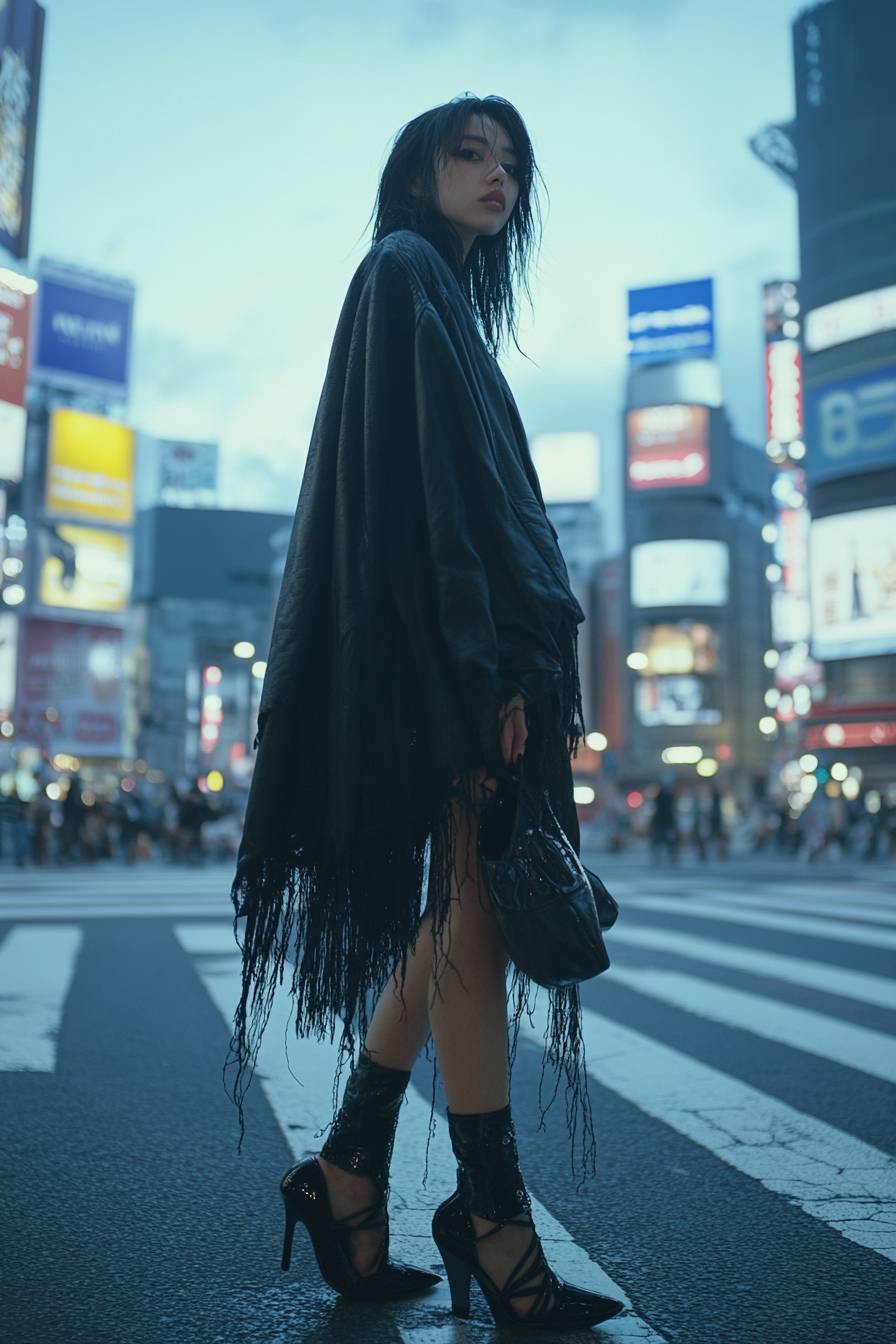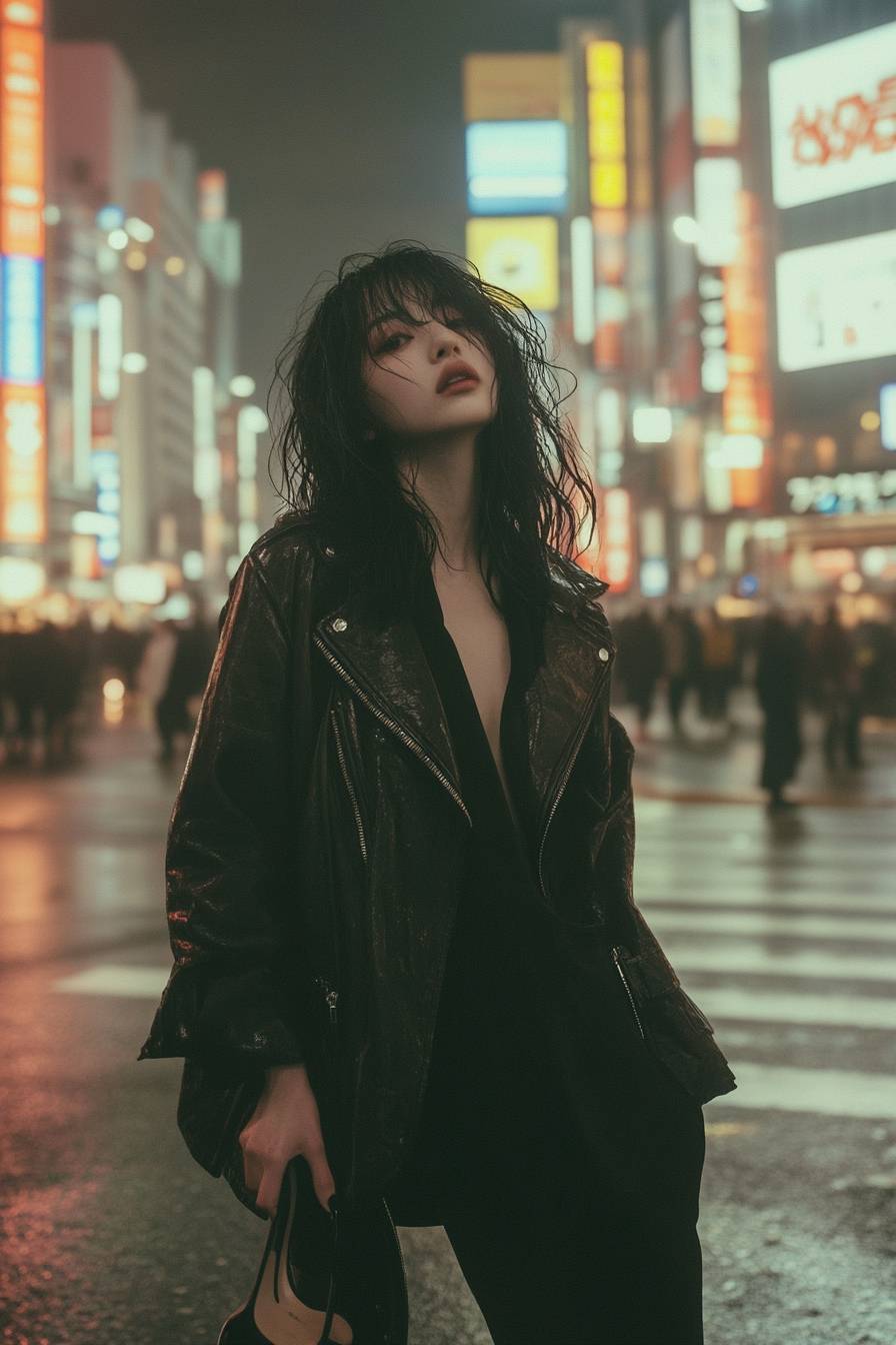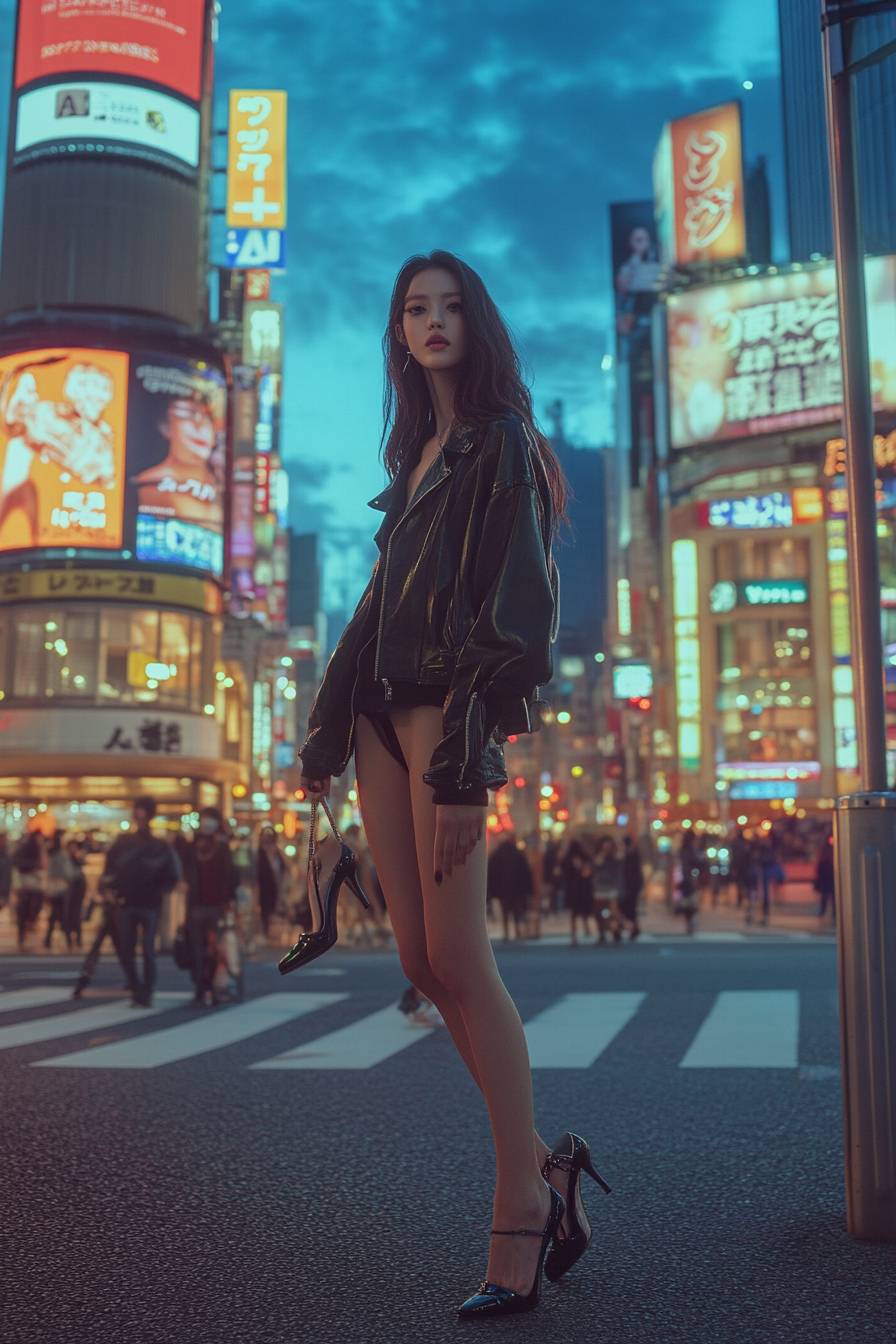 A Japanese model stands barefoot in Shibuya Crossing, holding high heels, draped in an oversized leather jacket, lost in a quiet moment.