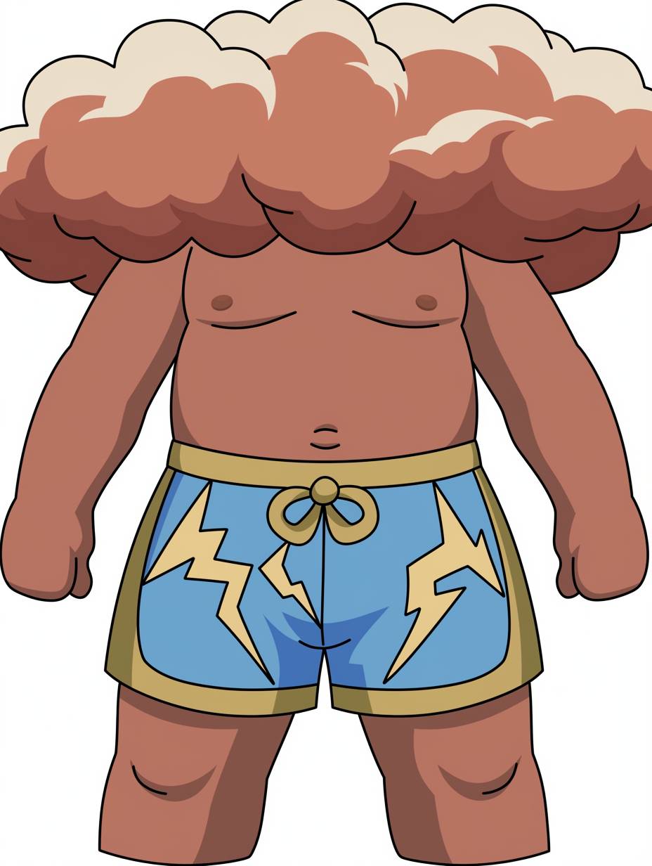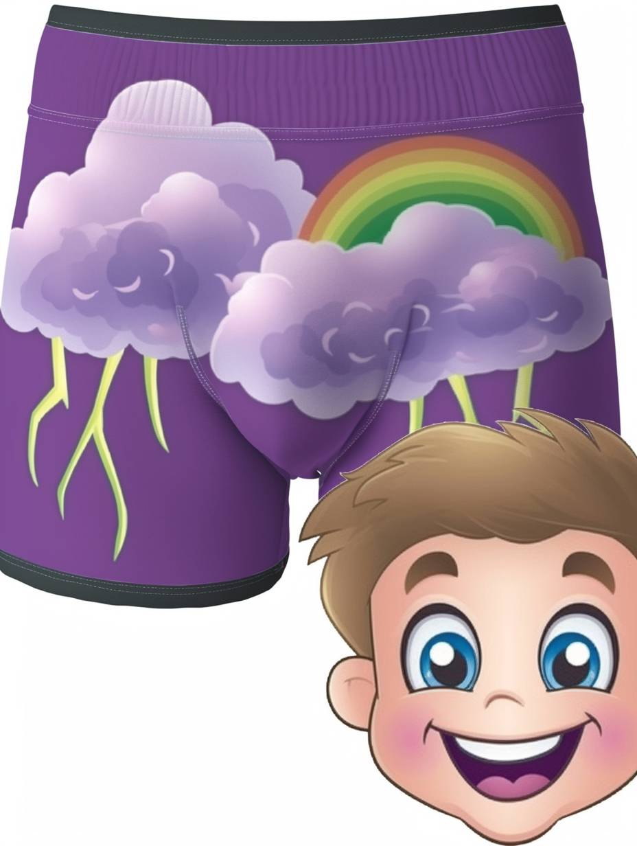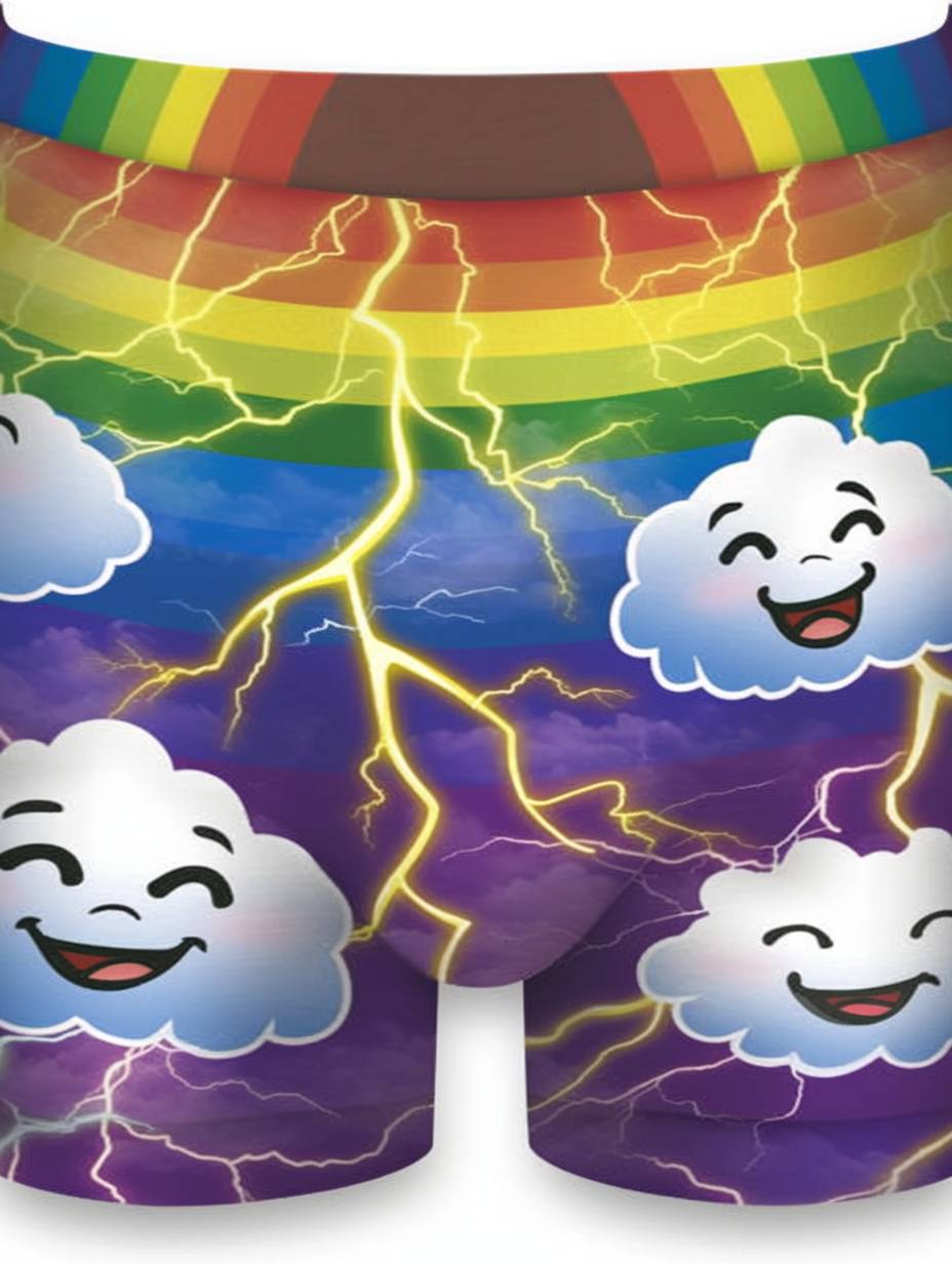 Colorful boxer shorts with lightning bolts and clouds, white background, cartoon style.