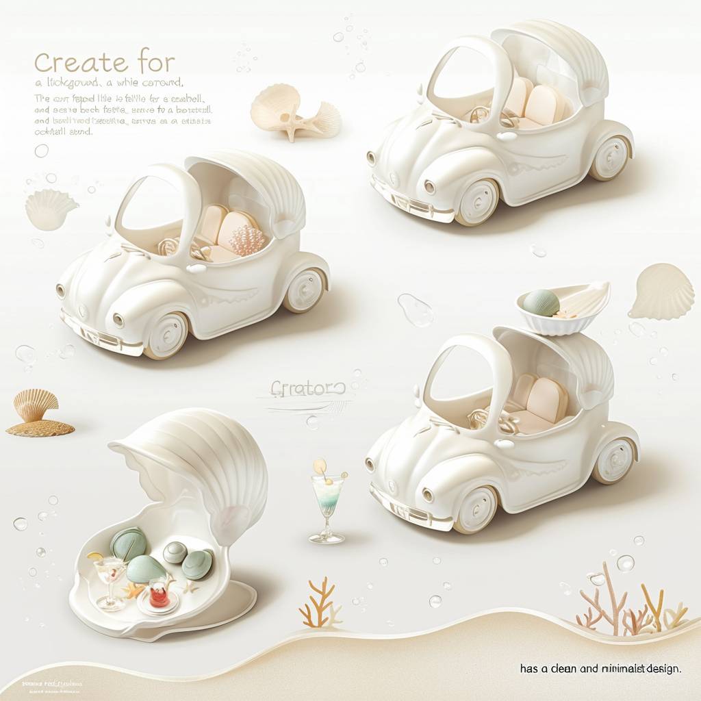 Design a white car shaped like a seashell for a beach festival, serving as a cocktail stand, with a clean and minimalist design.