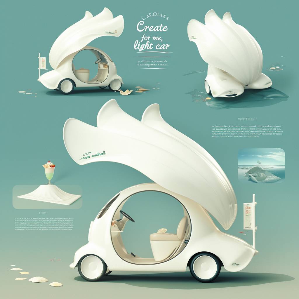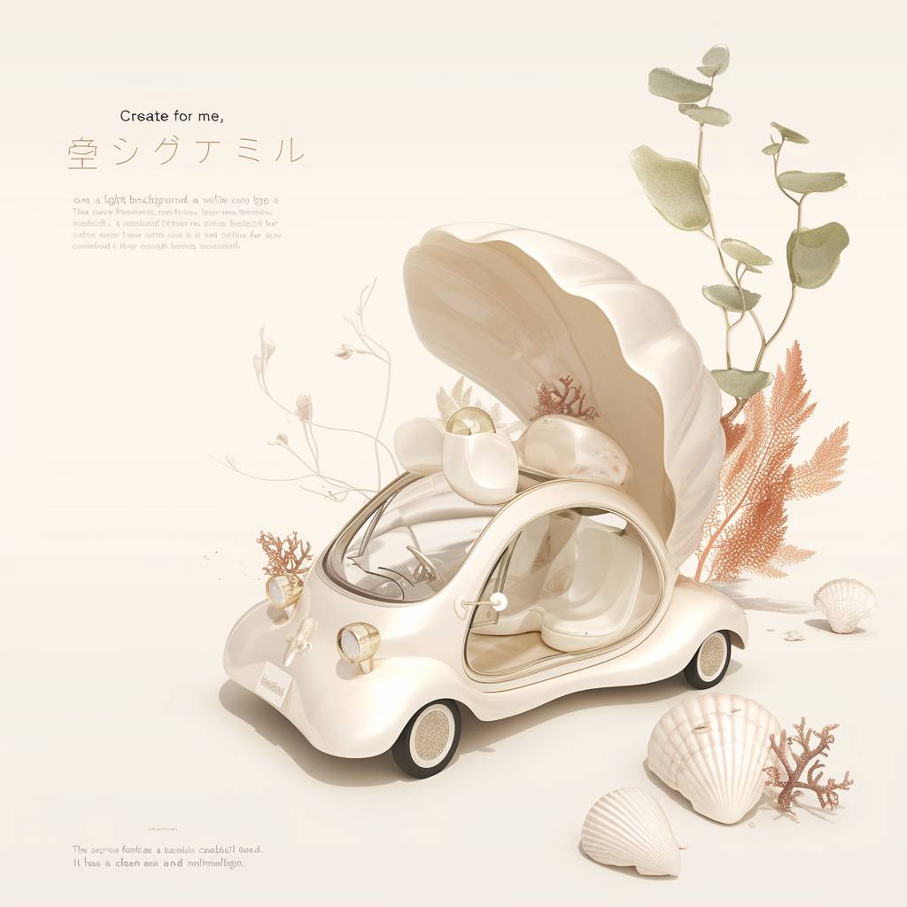 "Create for me, on a light background, a white car shaped like a seashell. The car is festive, suitable for a beach festival, and serves as a cocktail stand. It has a clean and minimalist design." --niji 6 --style raw