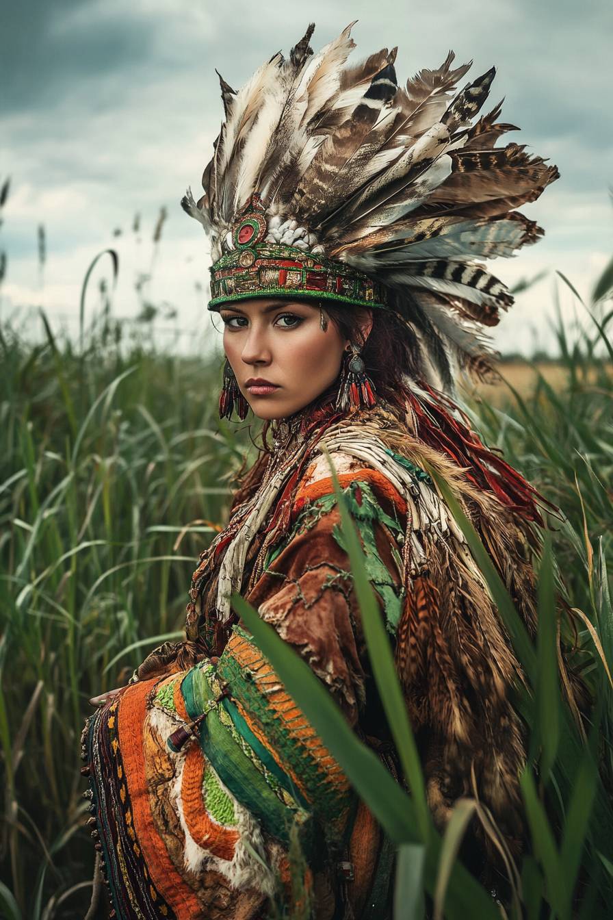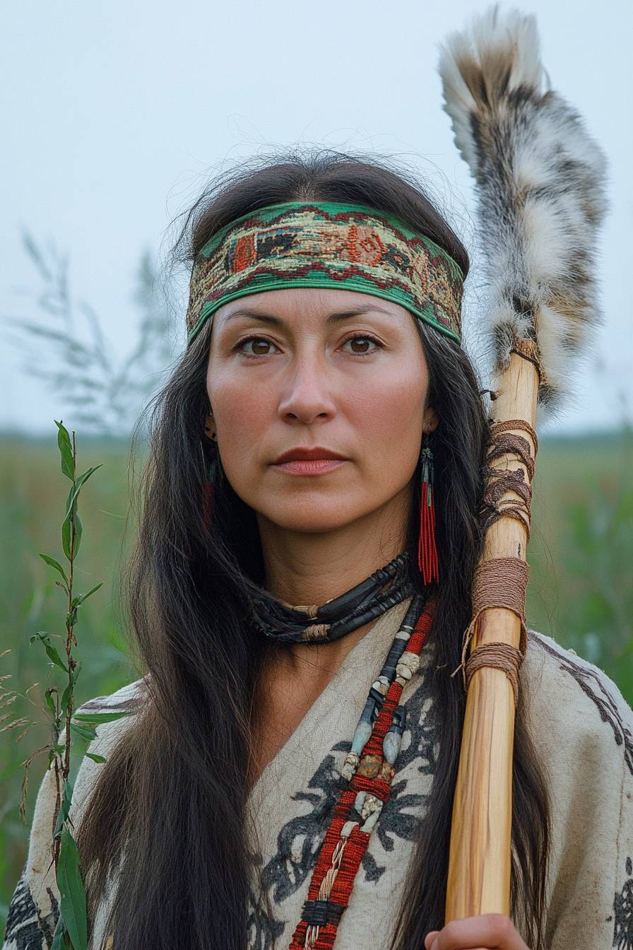 Portrait of a shaman-huntress in morning marshes