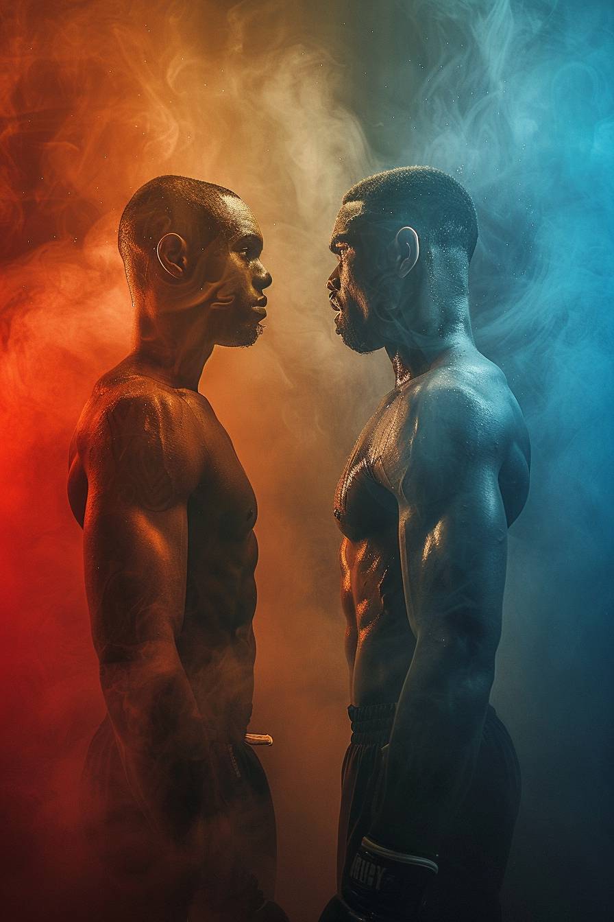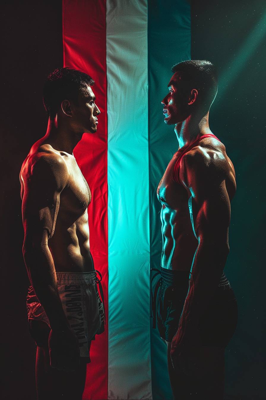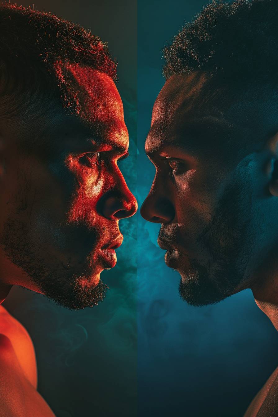 Split view of fighter athletes with dramatic lighting and subdued colors.
