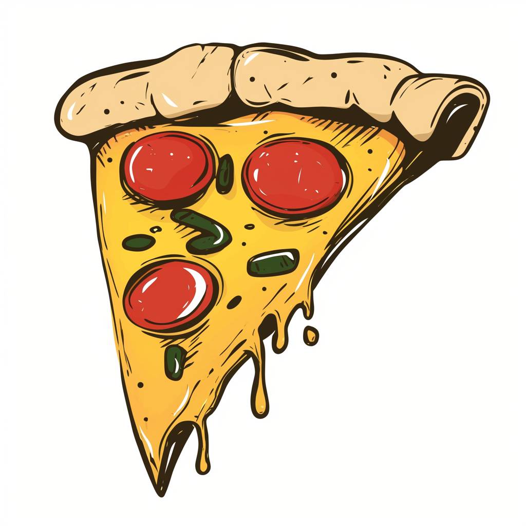Cartoon style, doodle art drawing of a slice of pizza. Low angle view, in doodle style by Mr. Doodle. Hand drawn cartoonish icons, minimalistic shapes and forms, simple thick lines, minimal design, simple shapes, broad thick line work, black and white with a little yellow accents, white isolated background, thick bold lines, no shadow.