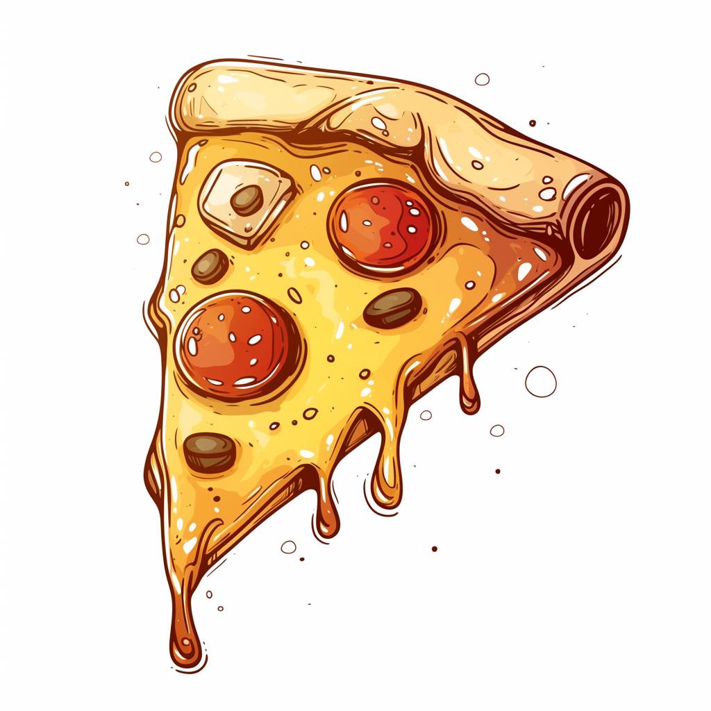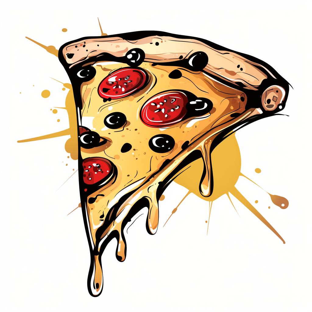 A doodle art drawing of a pizza slice in cartoon style, black and white with some yellow accents.