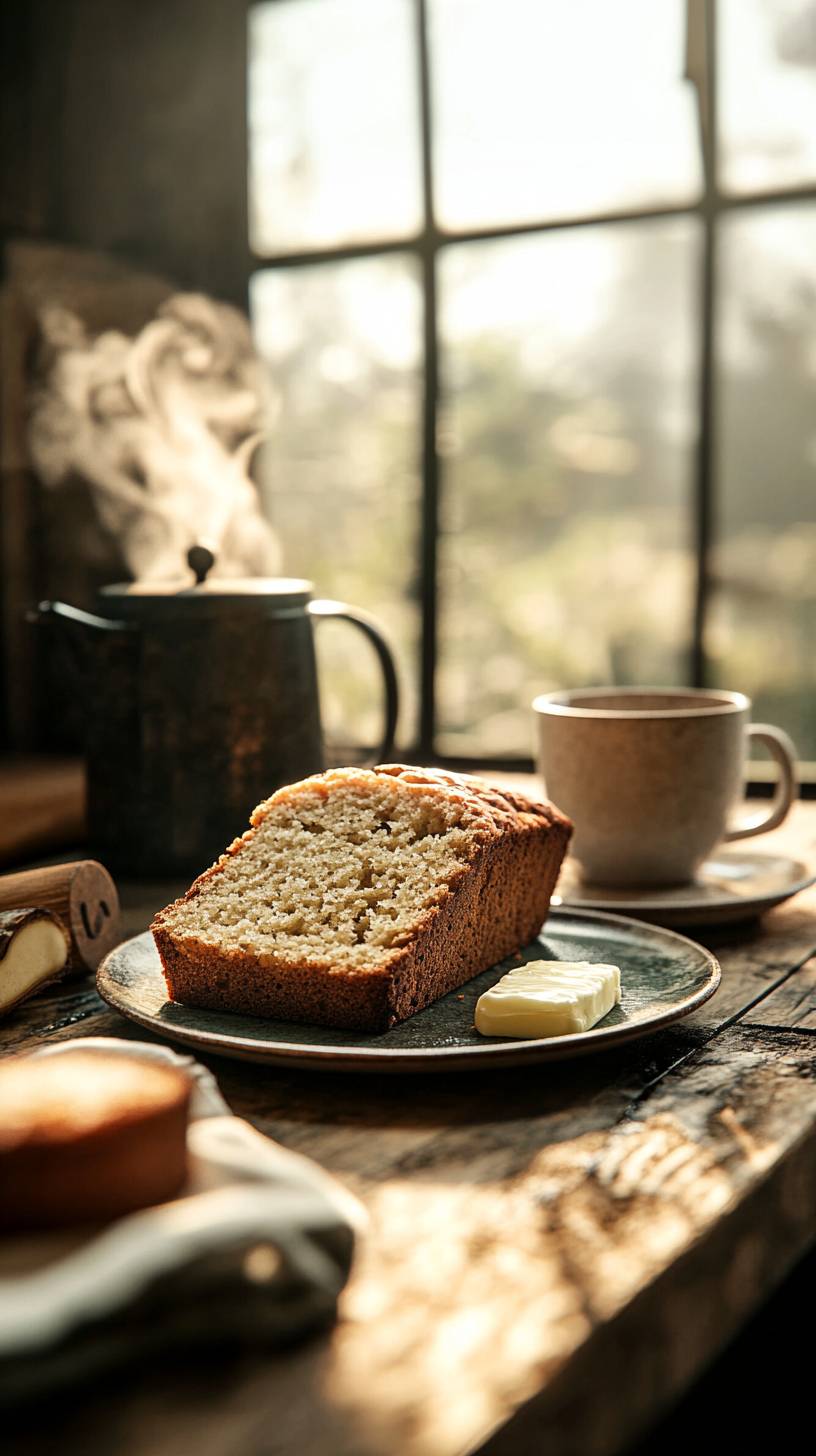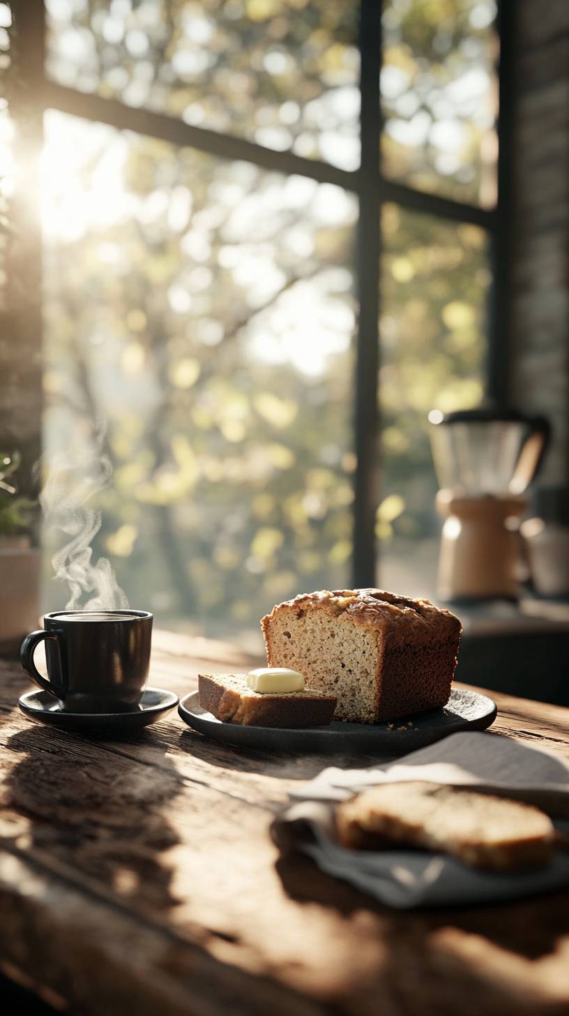 A hyper-realistic, vertical 9:16 image of a freshly baked loaf of moist banana bread on a rustic wooden kitchen counter. One slice is cut and placed on a plate with a pat of melting butter. A steaming cup of coffee sits nearby, and soft morning light streams through a window, creating a cozy, homey atmosphere. The details are rich, with golden-brown crust texture, visible flecks of banana, and subtle cinnamon swirls, evoking warmth and nostalgia. --ar 9:16 --profile ugbruyg --v 6.1 --style raw