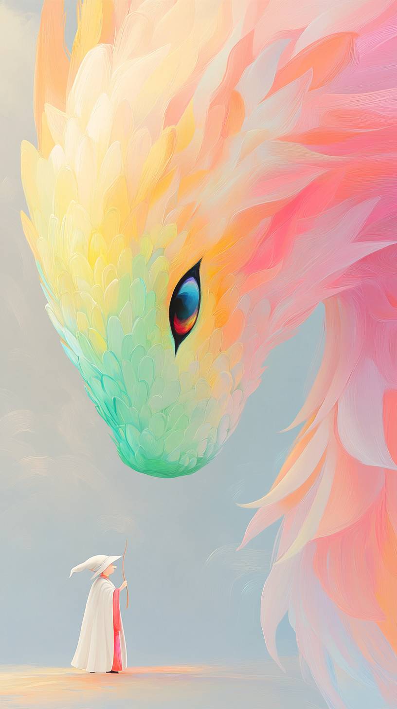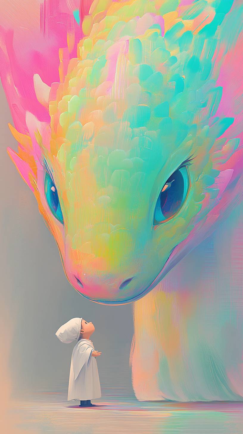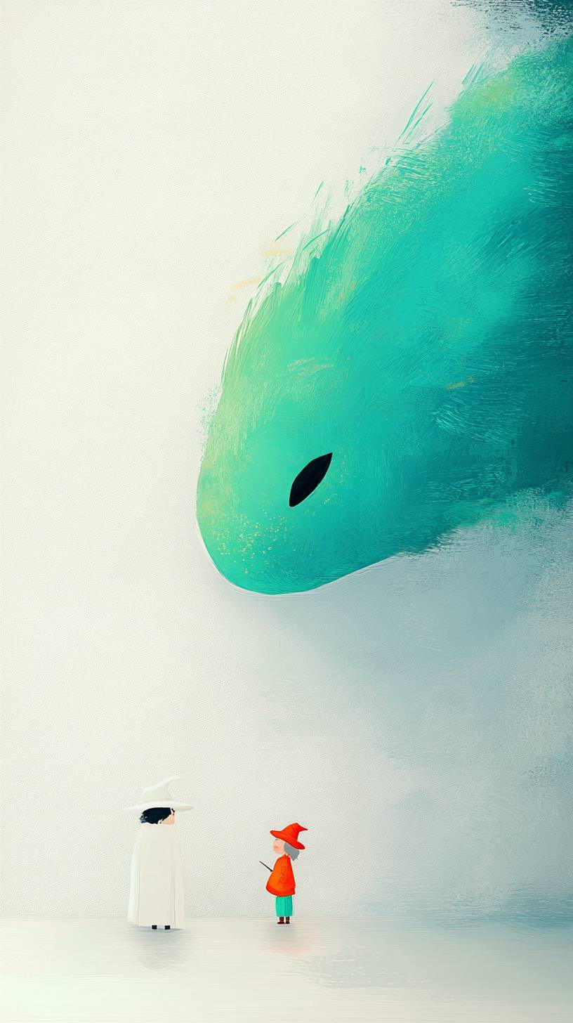 A playful dragon with emerald green scales stands next to a small wizard, featuring exaggerated brushstrokes, a colorful ink painting style, exaggerated contrast between light and dark, a stormy grey background, and pure colors. This is an illustration with high resolution and high detail, in an ultra-high definition style. --ar 9:16 --style raw --profile fshgid6 --stylize 250 --v 6.1