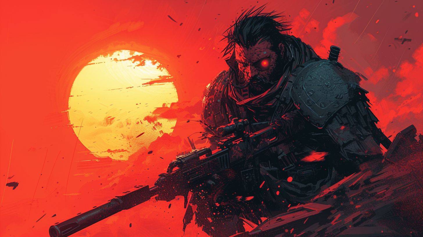 A post-apocalyptic warrior fights among the ruins of a destroyed city, equipped with scavenged metal plates and leather, holding a modified double-barreled shotgun, as the setting sun casts dramatic shadows in an intense urban warfare scene.