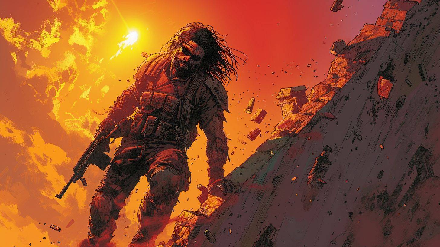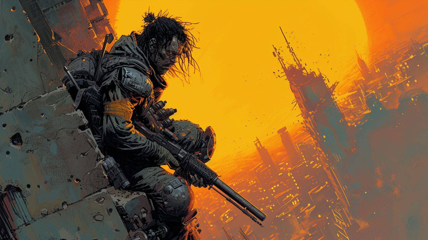 Comic book illustration in the style of Simon Bisley featuring a post-apocalyptic warrior, wearing scavenged metal plates and leather, holding a double-barreled shotgun with makeshift modifications, in an intense scene of urban warfare, among the ruins of a destroyed city, with the setting sun casting long shadows, viewed from a high angle emphasizing dynamic movement, dark fantasy, dramatic contrasts, bold strokes --ar 16:9 --v 6 --stylize 250