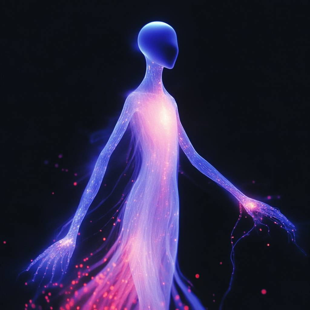 Bioluminescent character figure on a black background