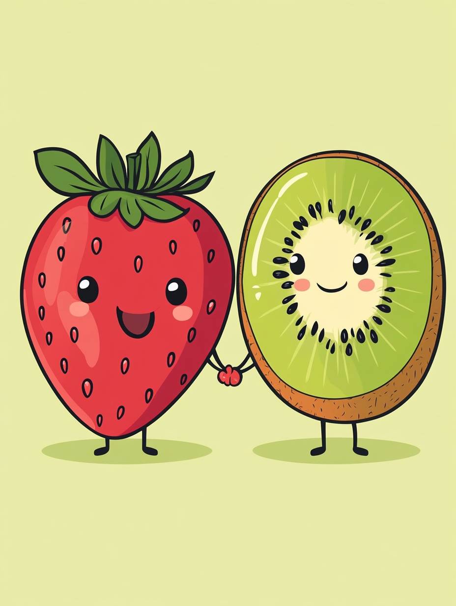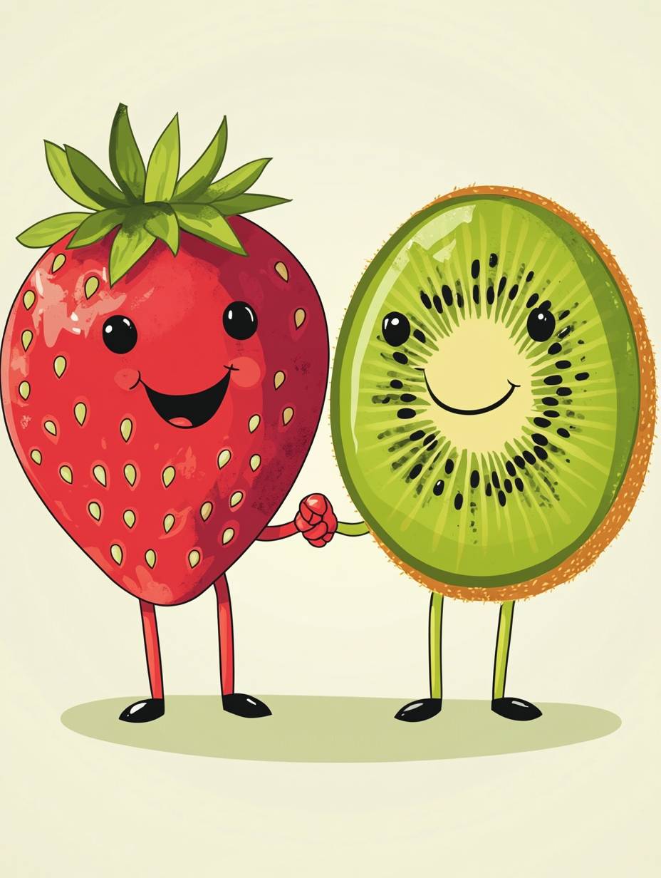 A cute 50s style cartoon featuring strawberry and kiwi holding hands and smiling in tropical colors.