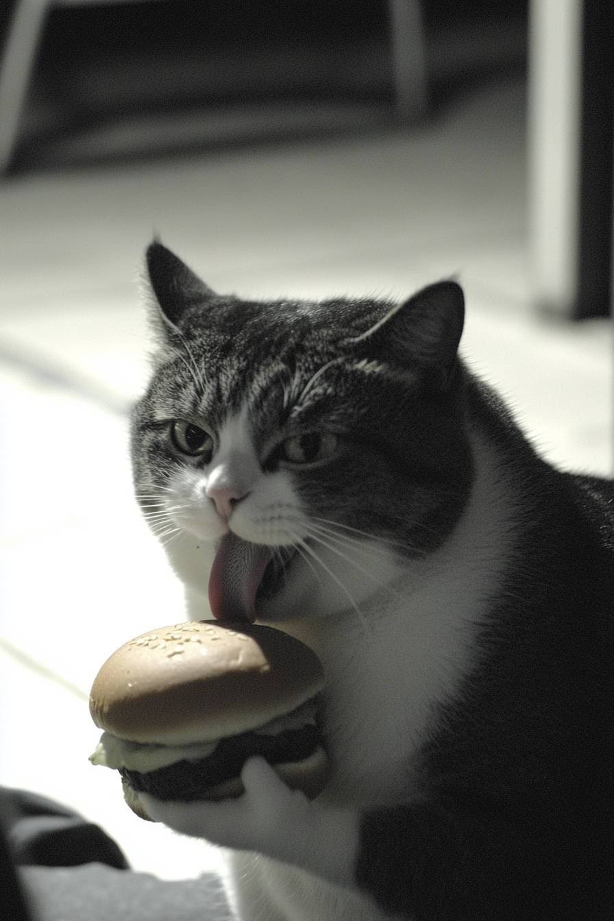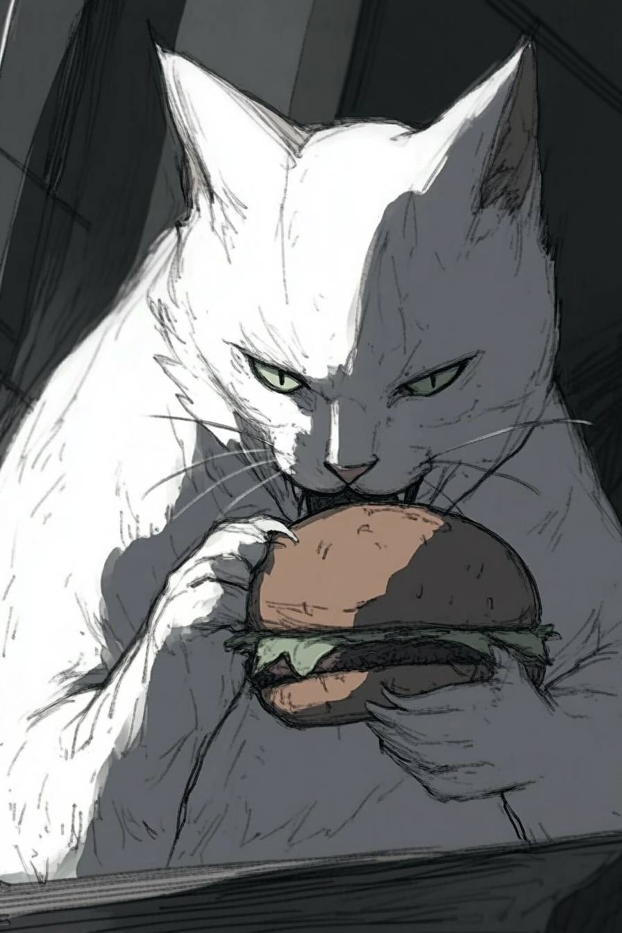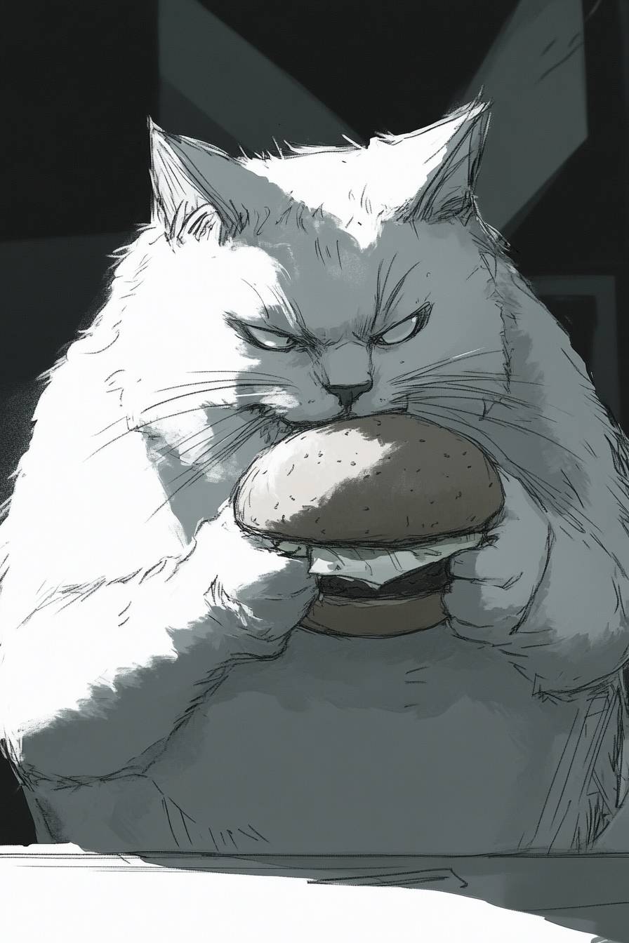 The fat cat is eating a hamburger. --sref 3659949077 --ar 2:3 --v 6.1