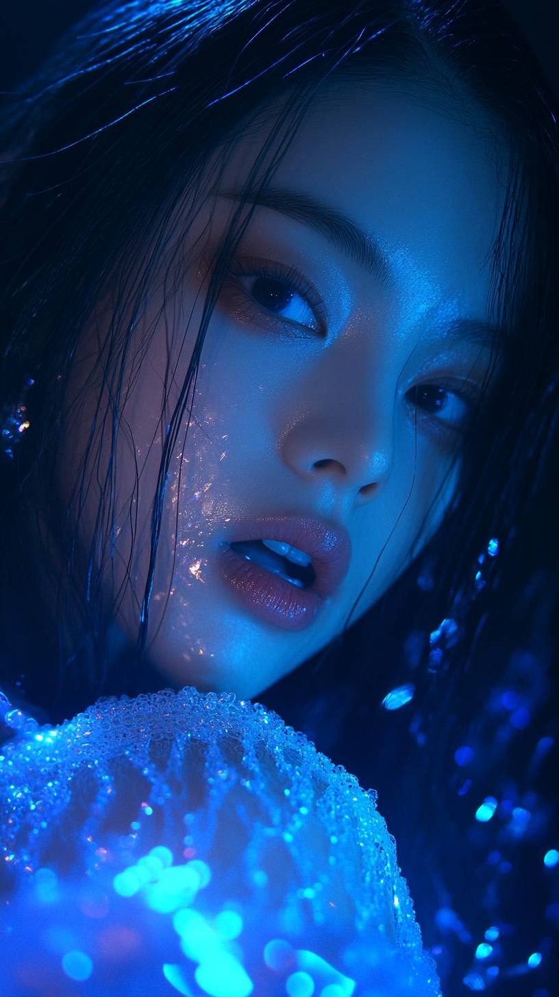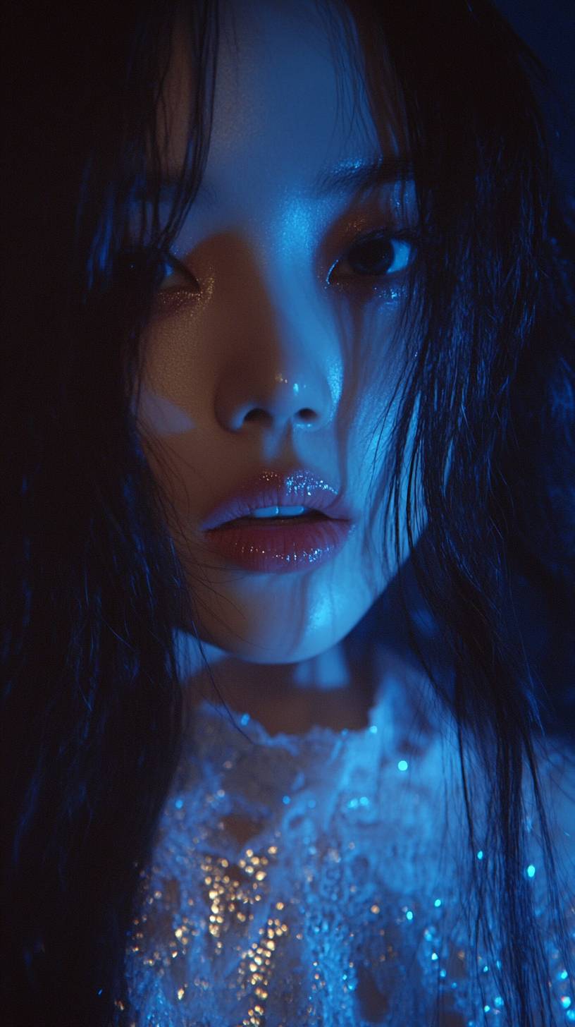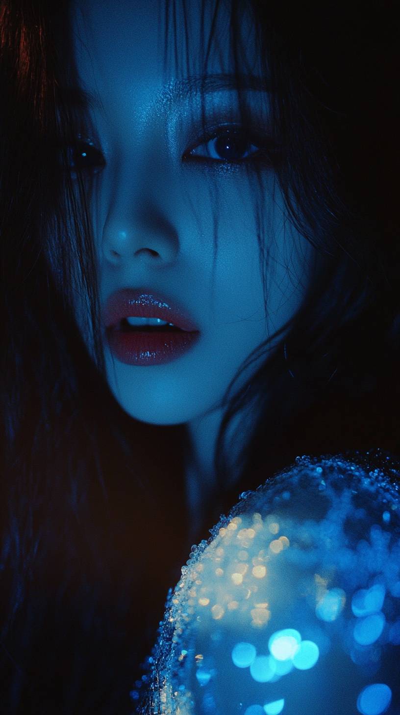 Close-up of a woman's mouth, Screencap of Blackpink's Jisoo from a music video, wearing a white sequin top with long sleeves and lace details, with blue light on her face, long dark hair, looking at the camera in the style of Korean fashion photography, against a dark background, with a 35mm film grain effect. --ar 9:16 --v 6.1