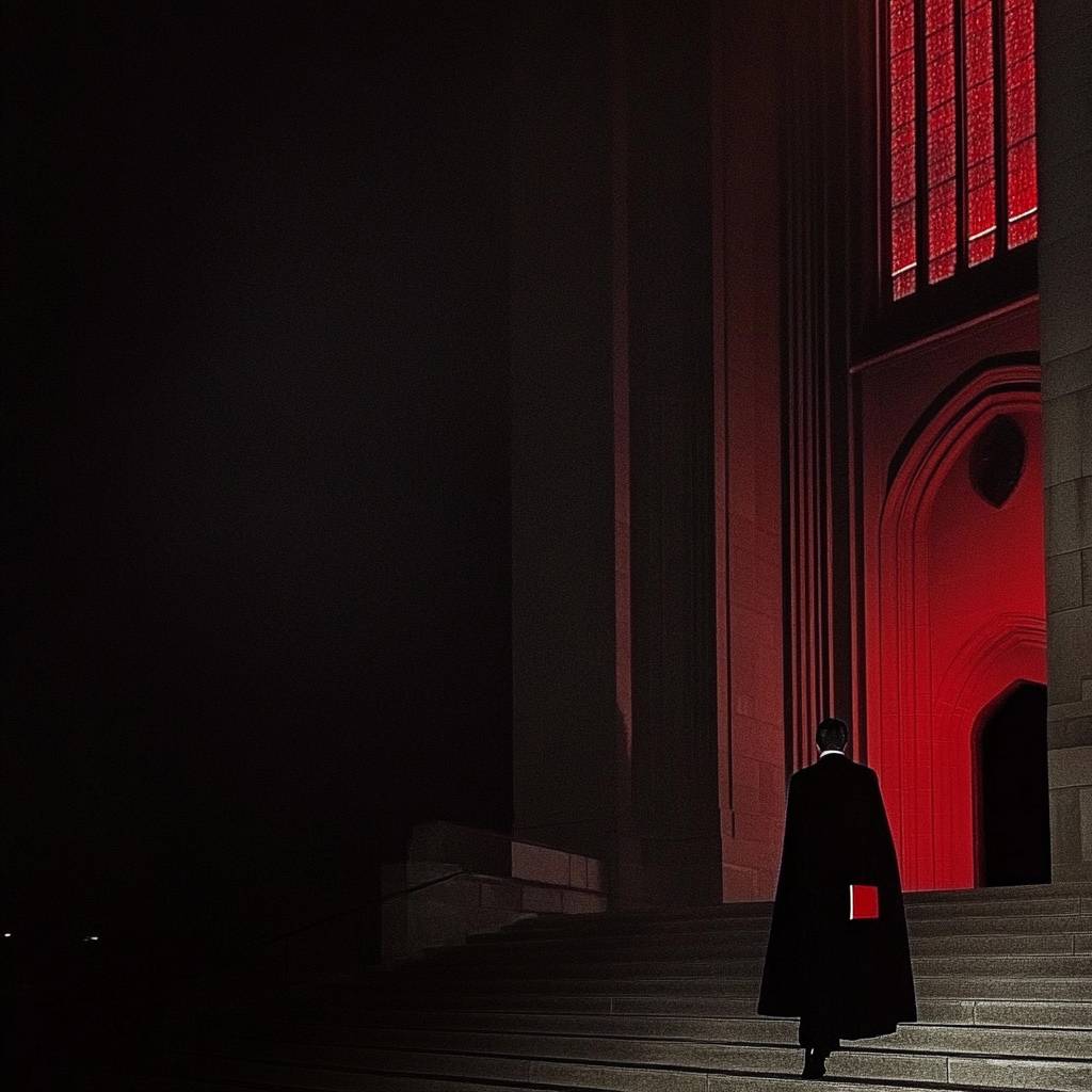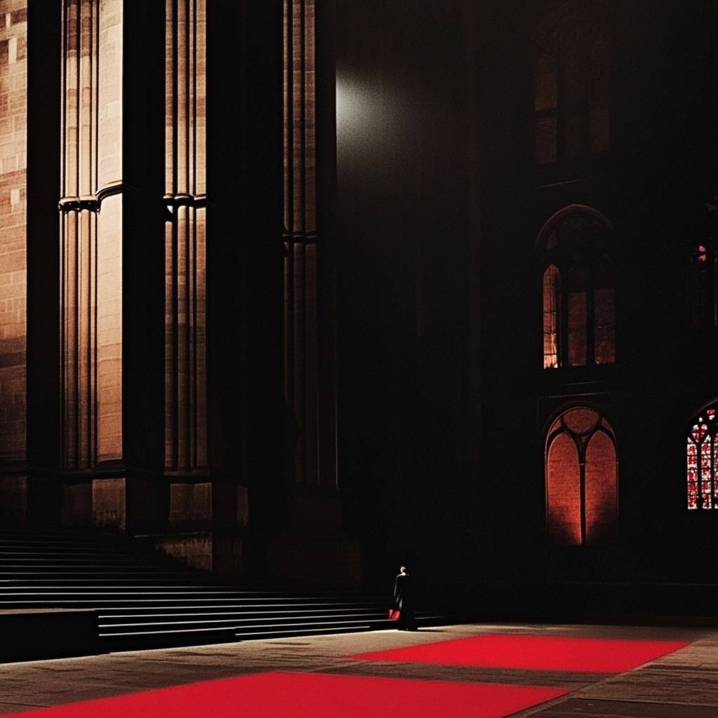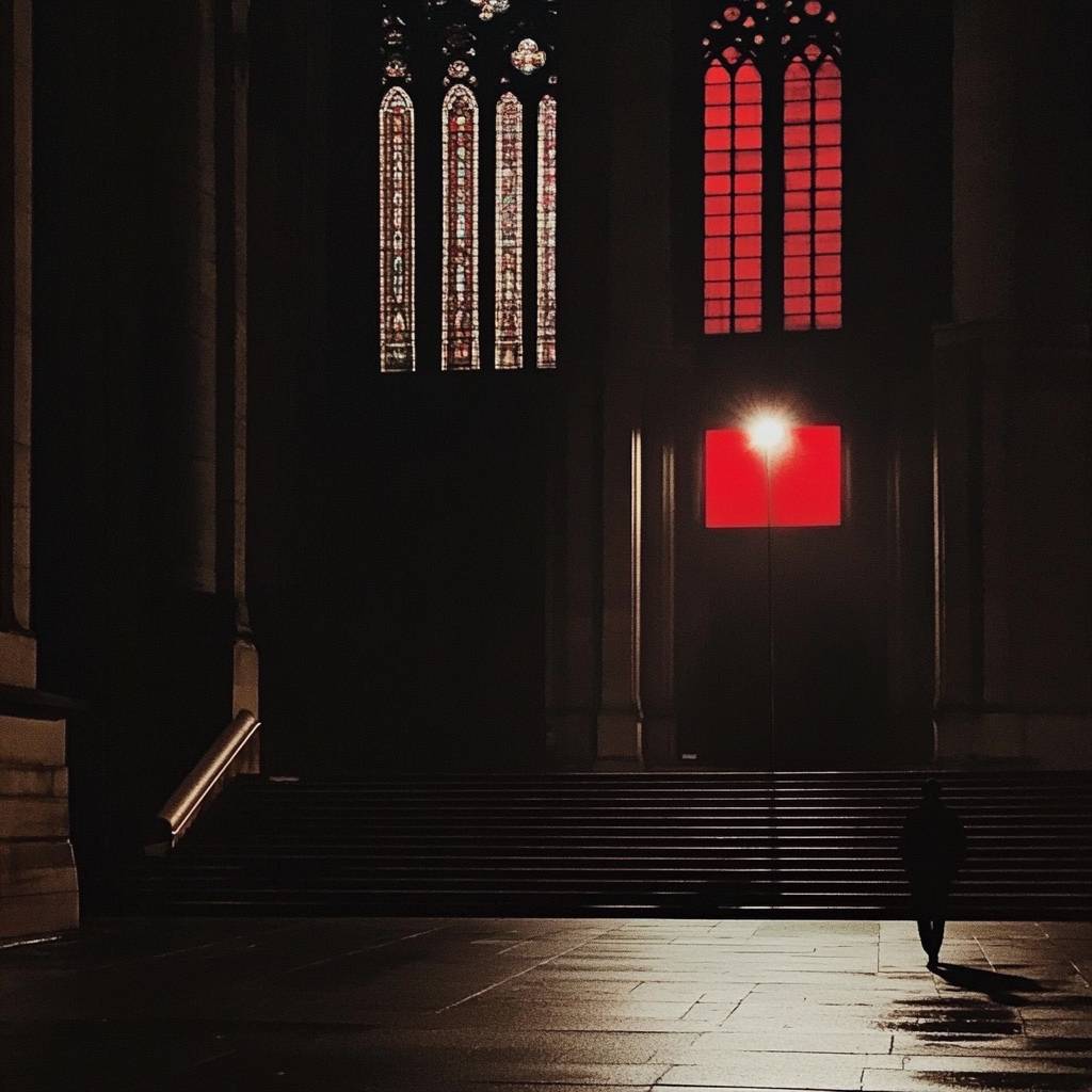 Gothic cathedral, dark stone, stained glass, foggy night.