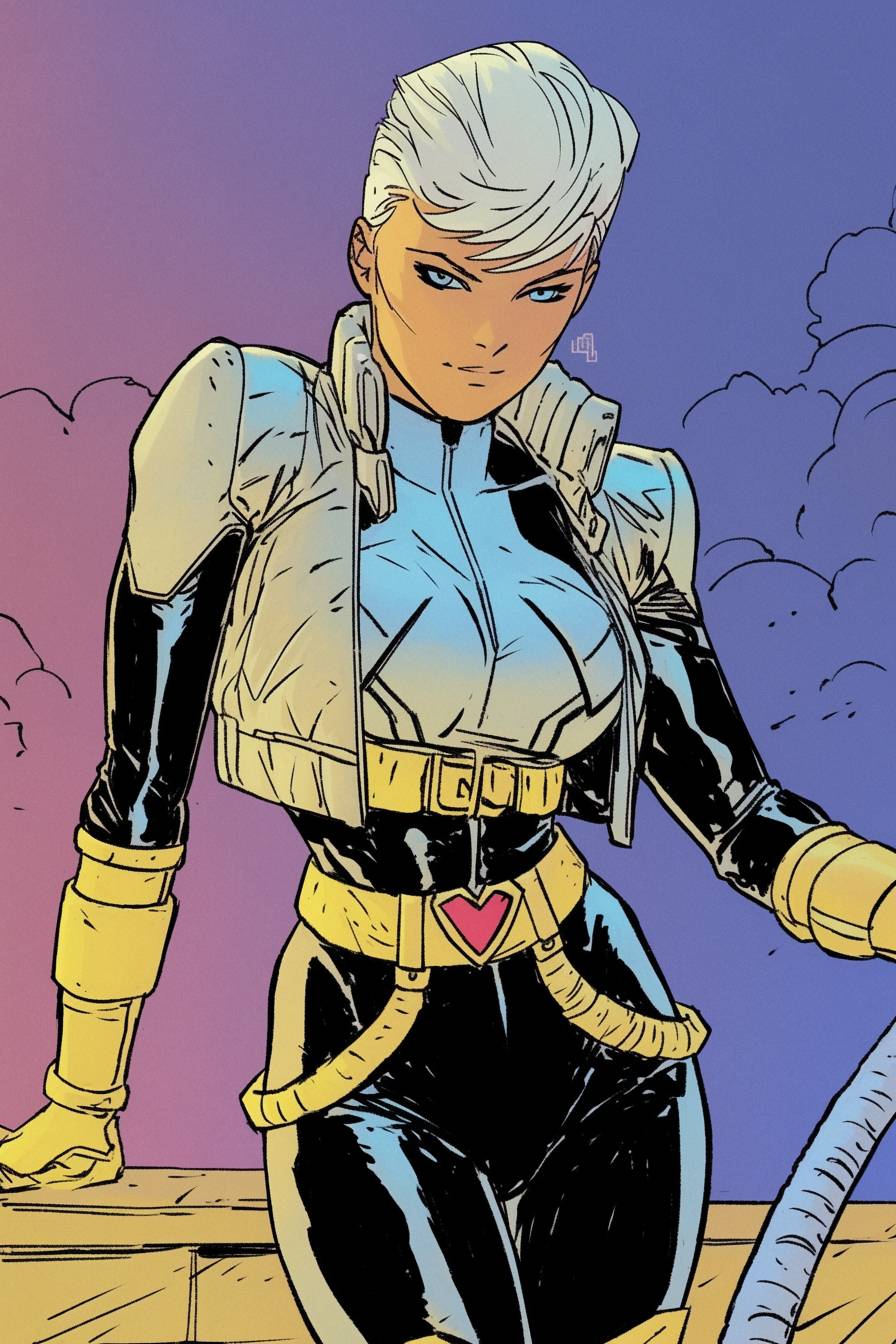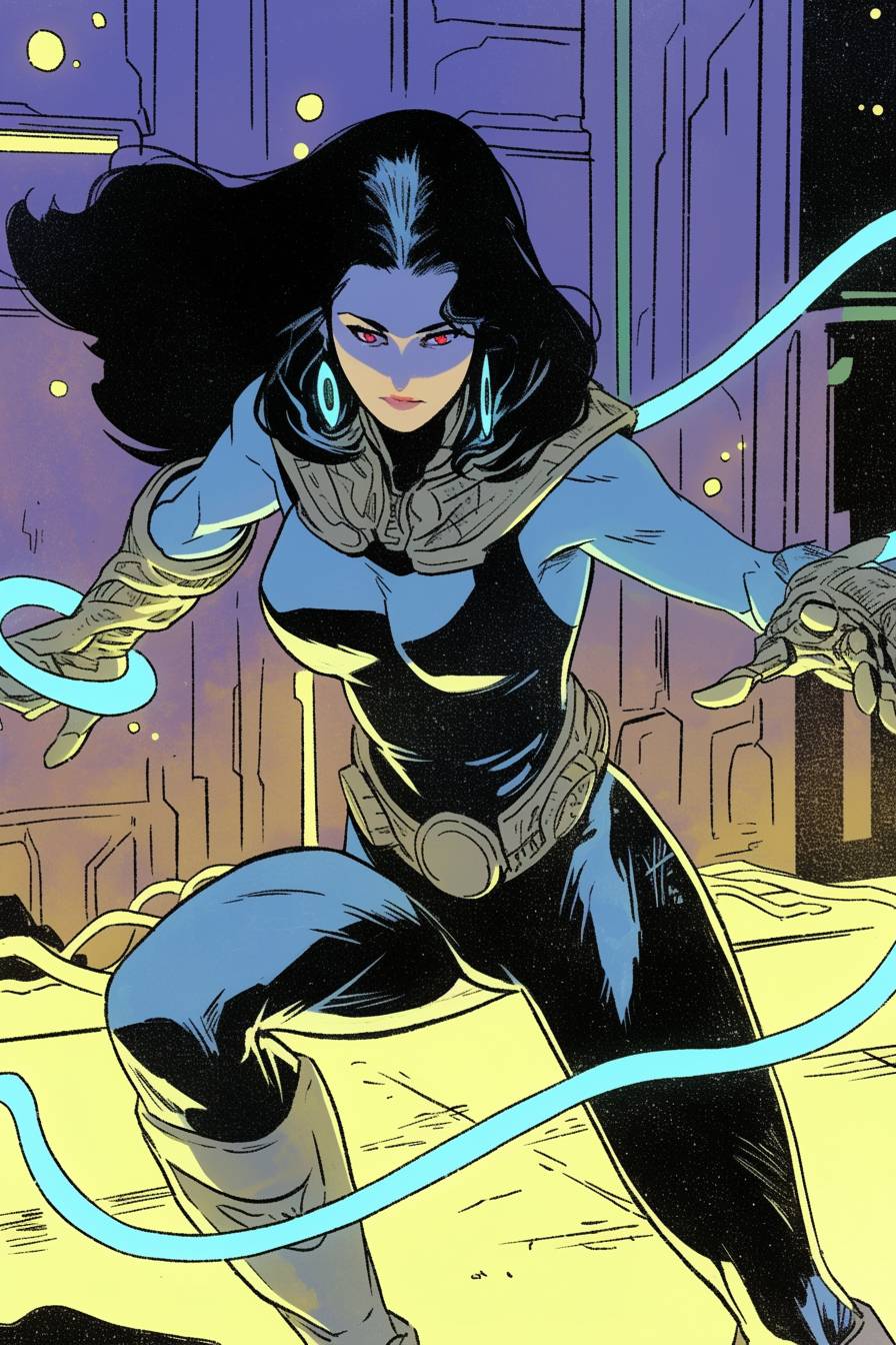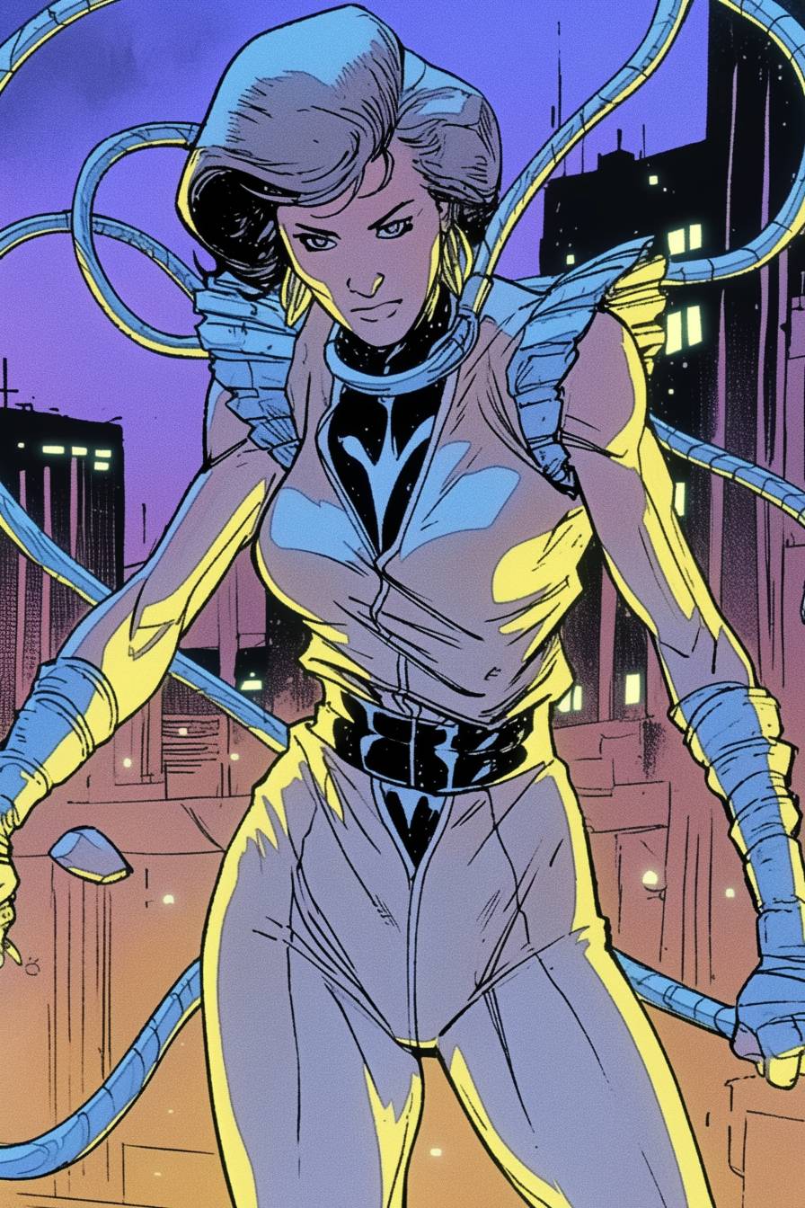 Scarlett Johansson as a cyberpunk hero in anime style, neon-lit city, detailed action pose.