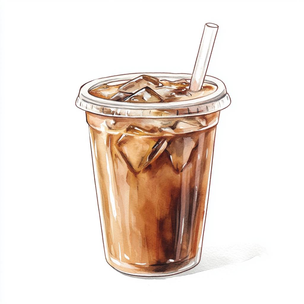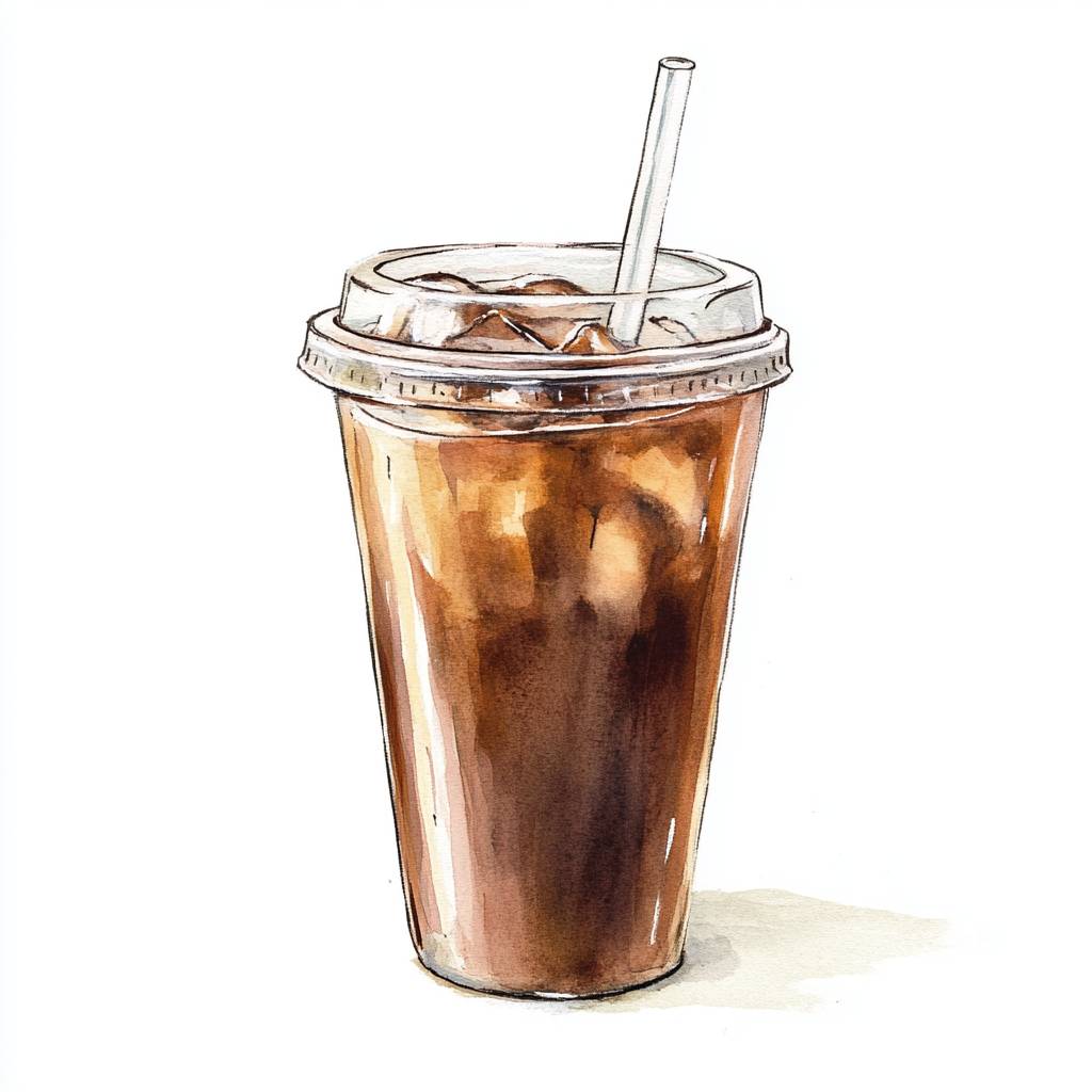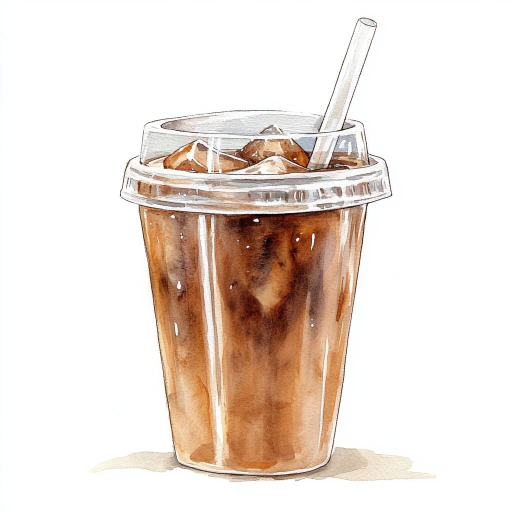 Watercolor illustration of an iced coffee in a clear plastic cup with a clear plastic lid and straw, isolated on a white background --v 6.1