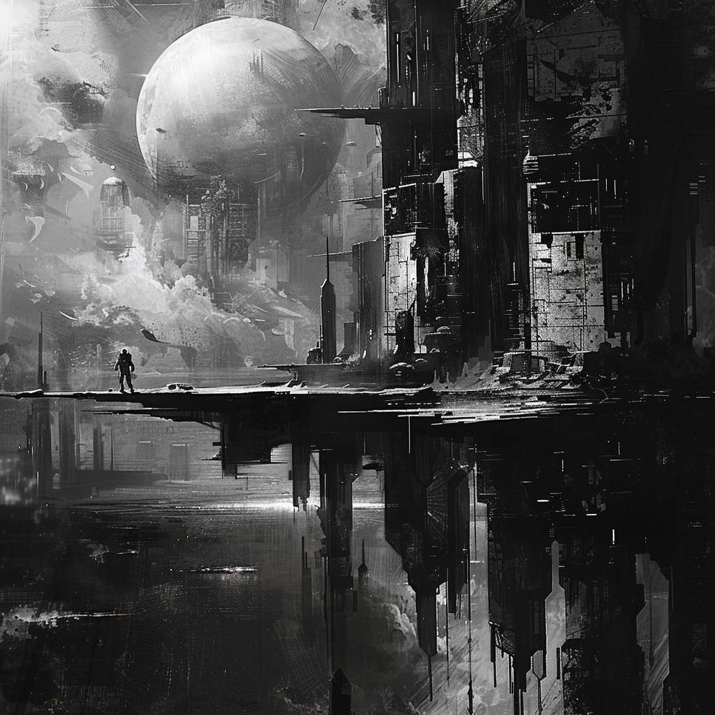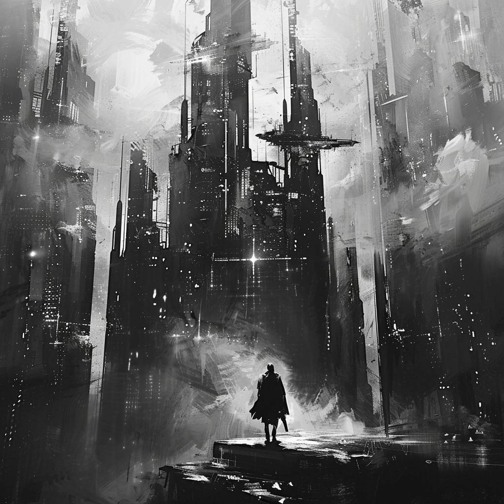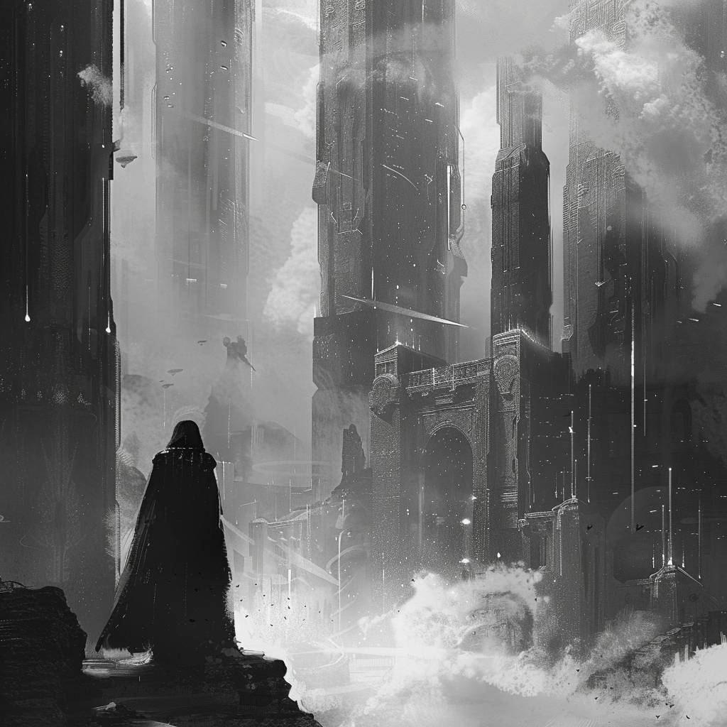 Predominantly black and white, the stark and moody palette contributes to a fusion of futuristic and historical elements.