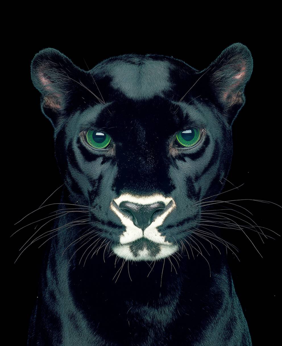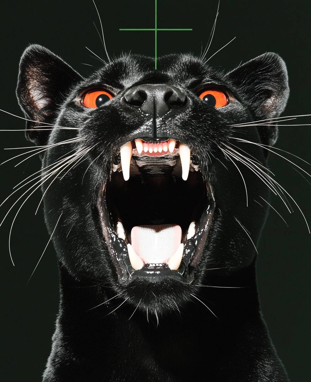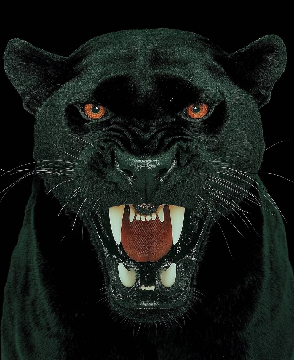 Close-up portrait of a panther-like creature with black fur and glowing amber eyes, emphasizing its predatory nature.