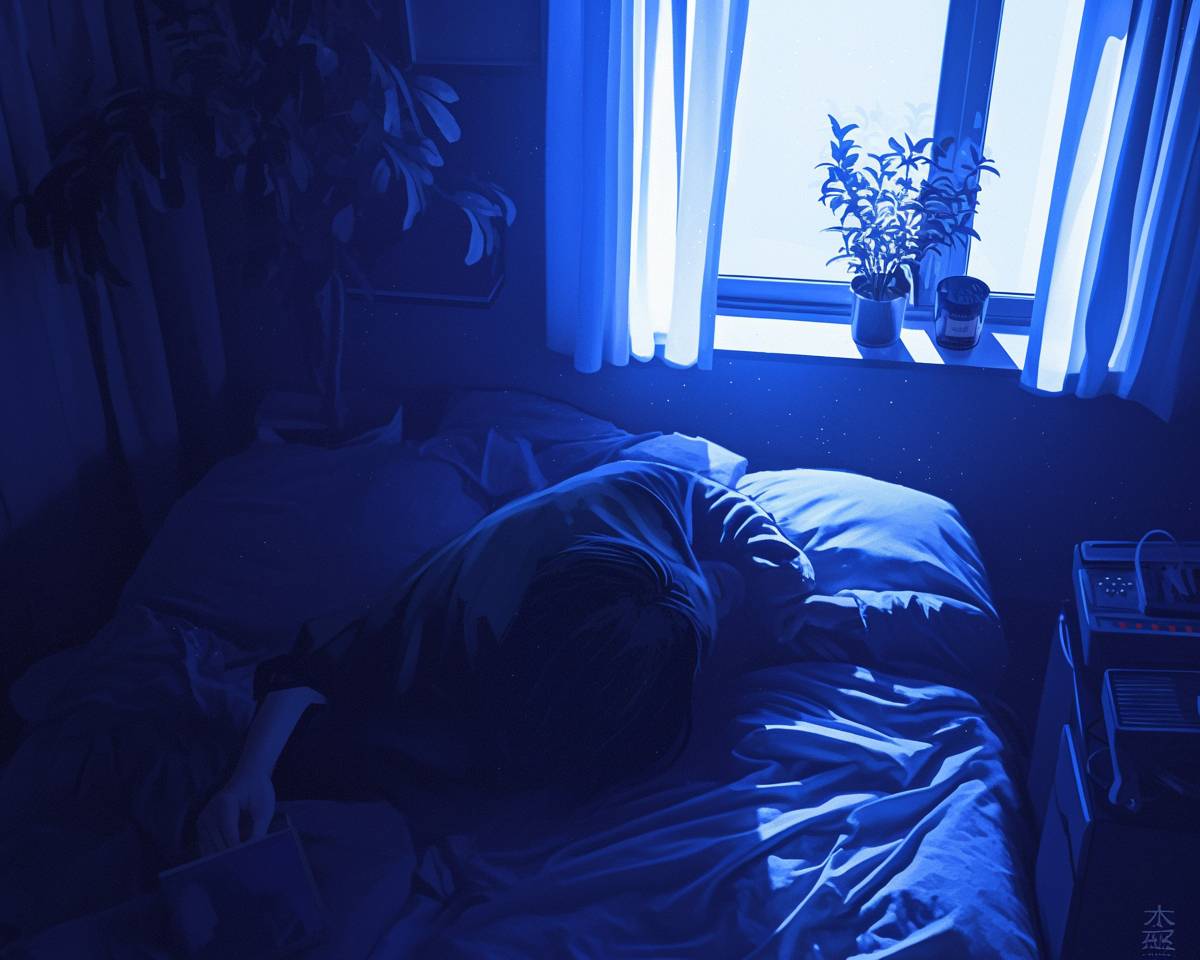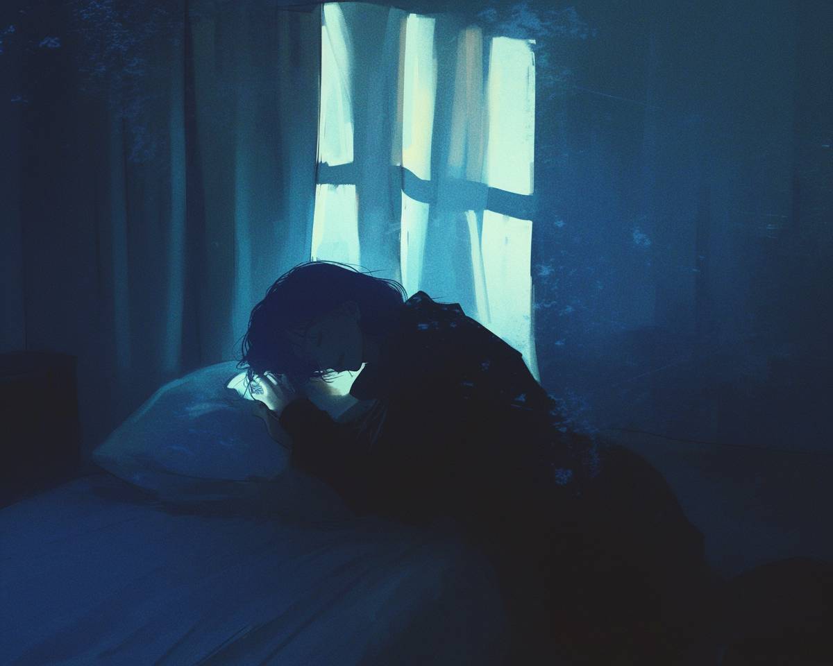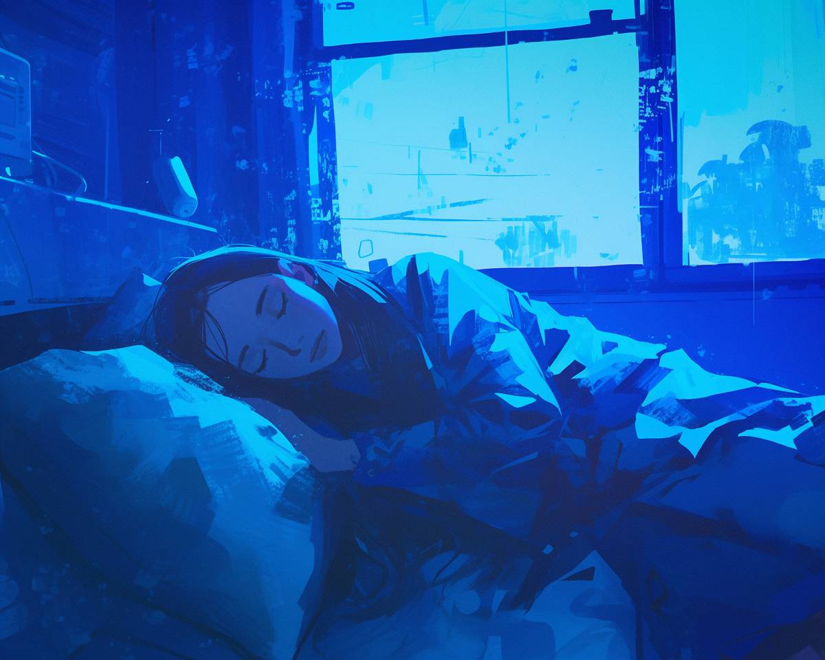 night shadows on woman sleeping, dramatic photo, blue and grey colors, high contrast, interior scene, Retro VHS Effect --ar 5:4 --niji 6