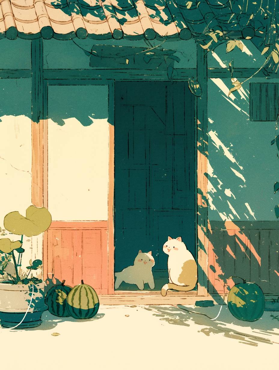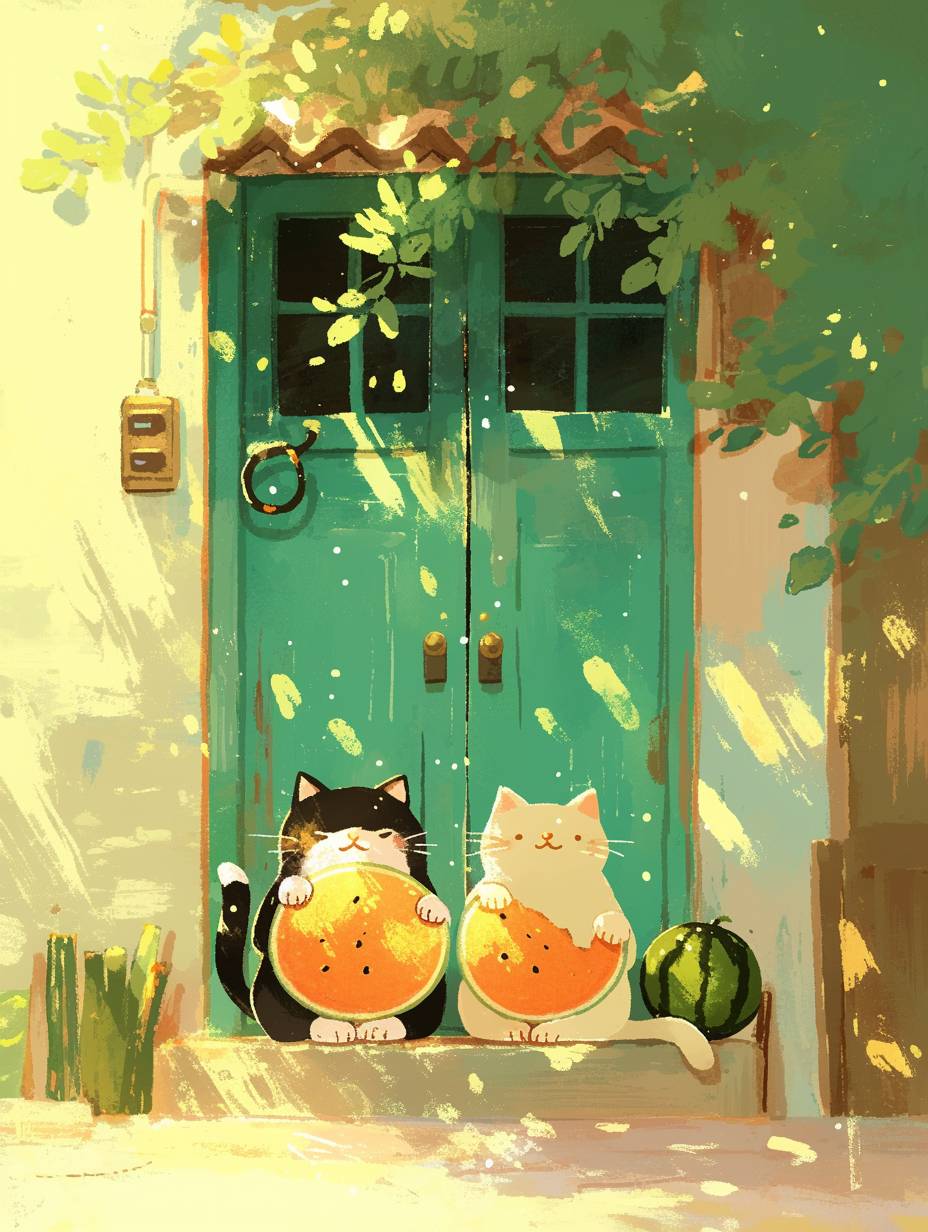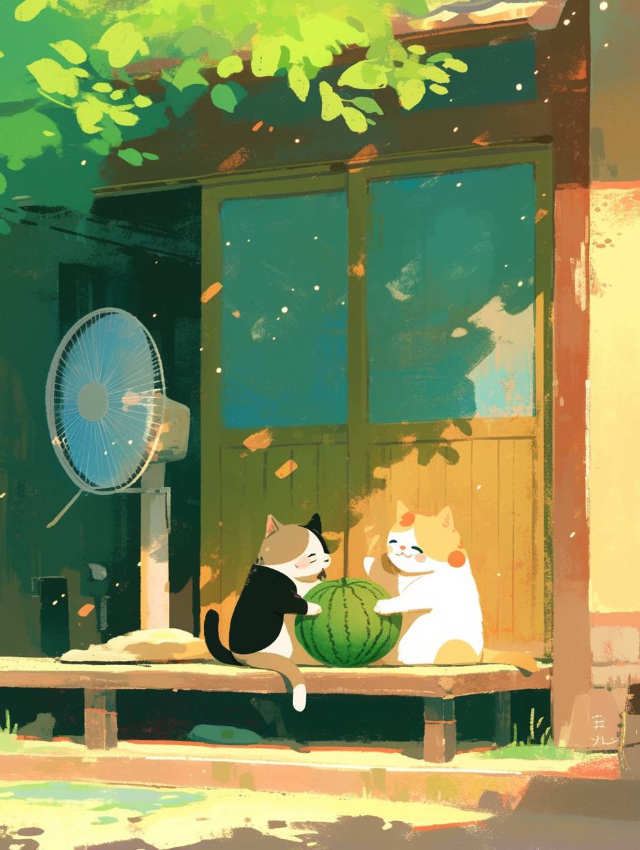 Under the tree shade, two cats are sitting at the door, holding watermelons in their hands, blowing electric fans, with patchy light spots, cartoonish and cute. Healing style, healing theme, minimalist illustration. --aspect 3:4 --niji 6