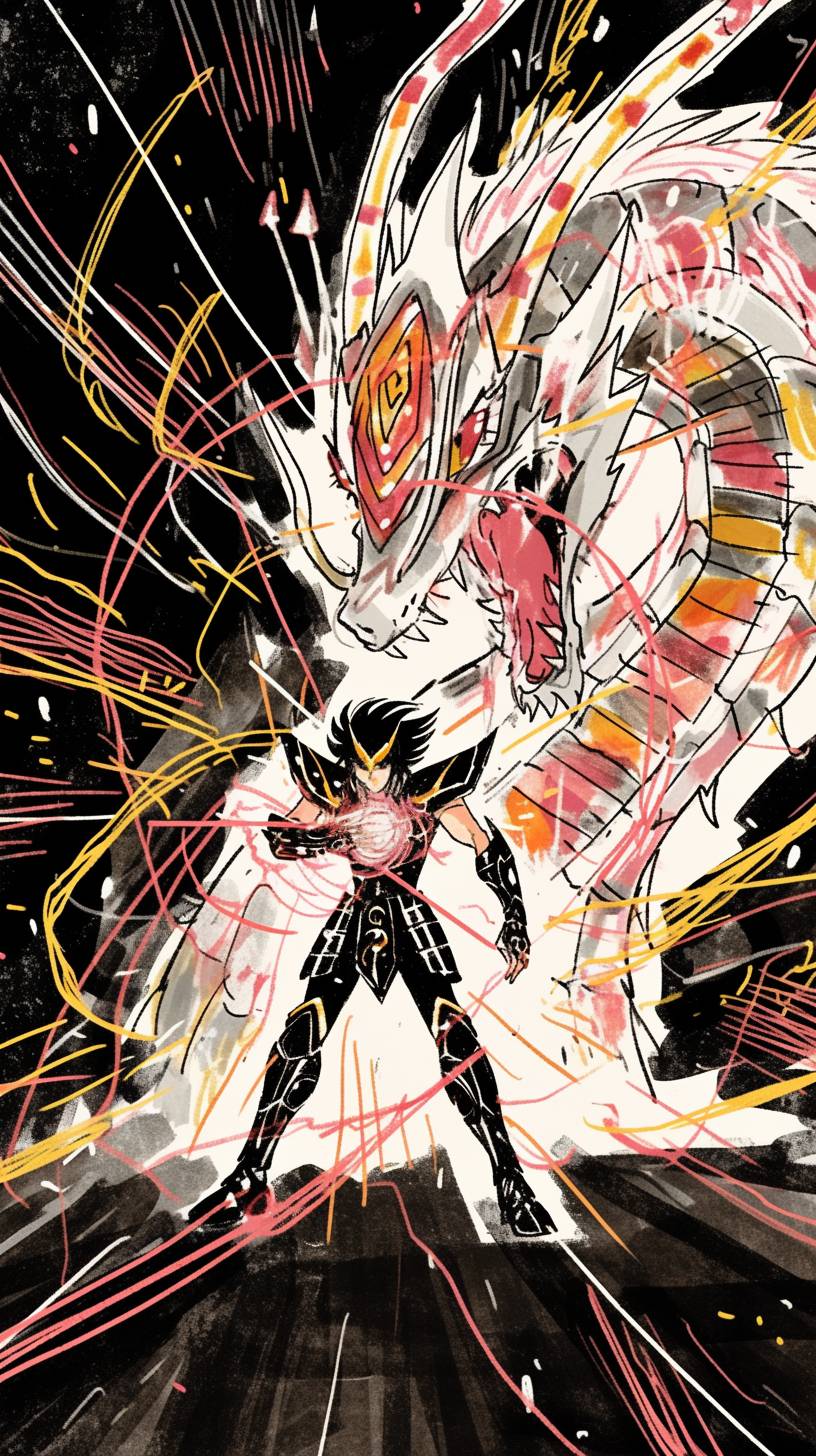 Dragon Shiryū is fighting in a stylish anime art style, blending elements from Saint Seiya, showcasing intense dynamics and colors.