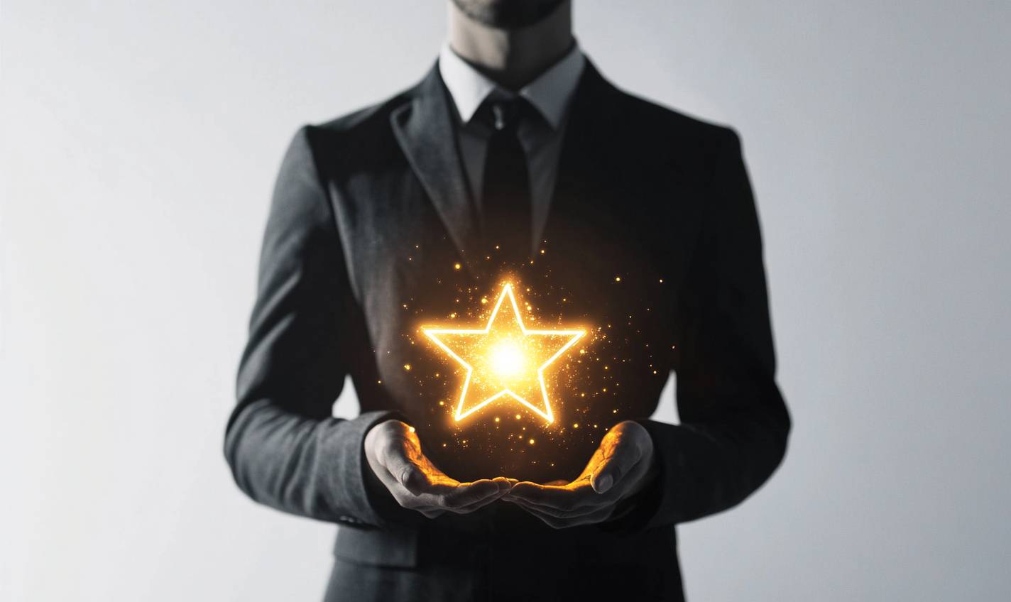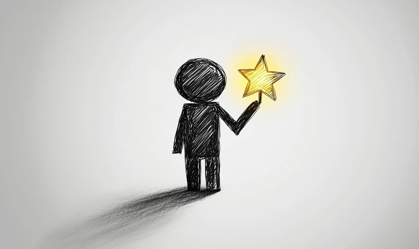 A minimalist pencil sketch of a geometric figure representing a professional holding a glowing star on a white background.