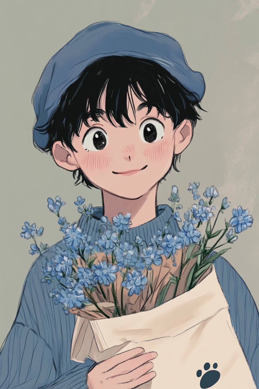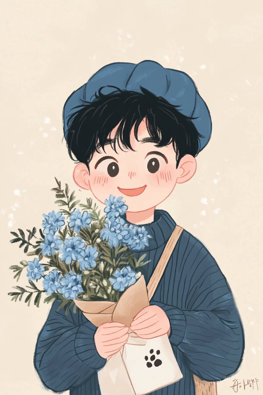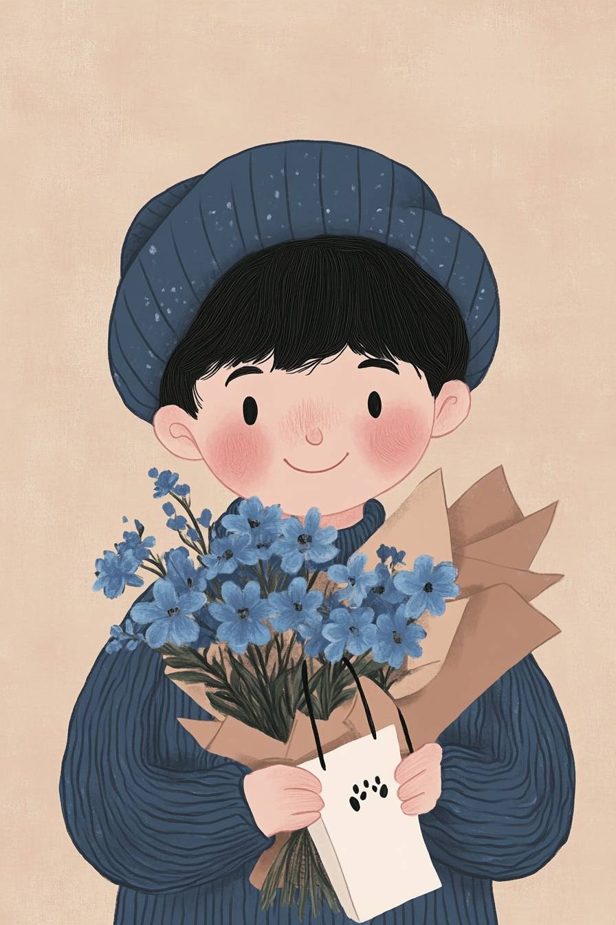 In a simple line-drawing style, Q-version, with soft and hazy illustrations featuring a boy with black hair, a cute, rosy-cheeked face smiling warmly, and a pink pout. He is wearing a blue beret and a blue knitted sweater. In his left hand, he holds a fresh bouquet of blue flowers wrapped in brown kraft paper. A small white bag with paw print details hangs diagonally across his chest. The artwork embodies minimalism, atmosphere, hazy and dreamy scenes, with a top-down perspective, creating a masterpiece.