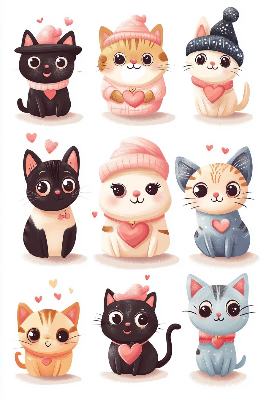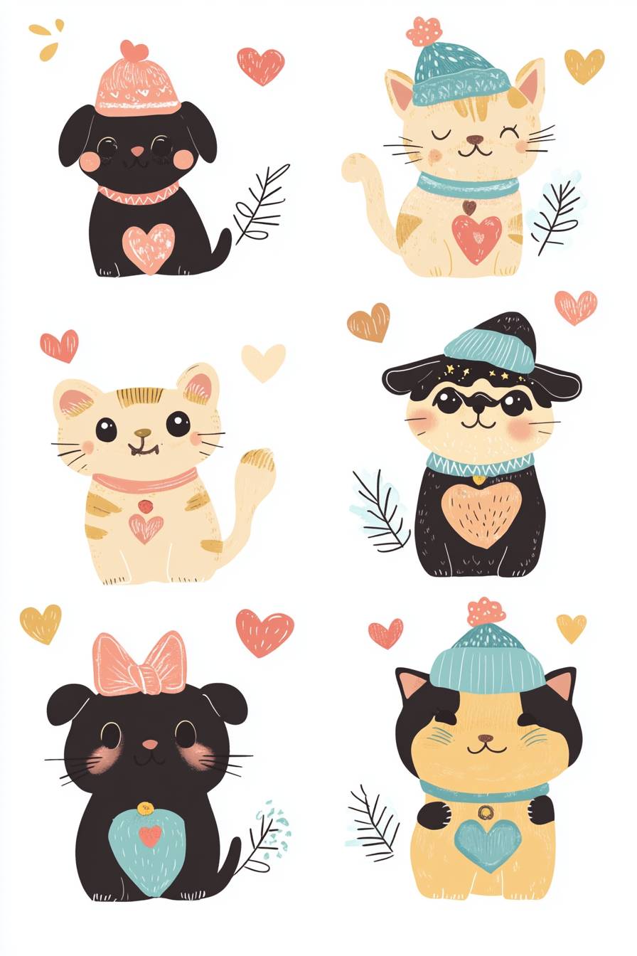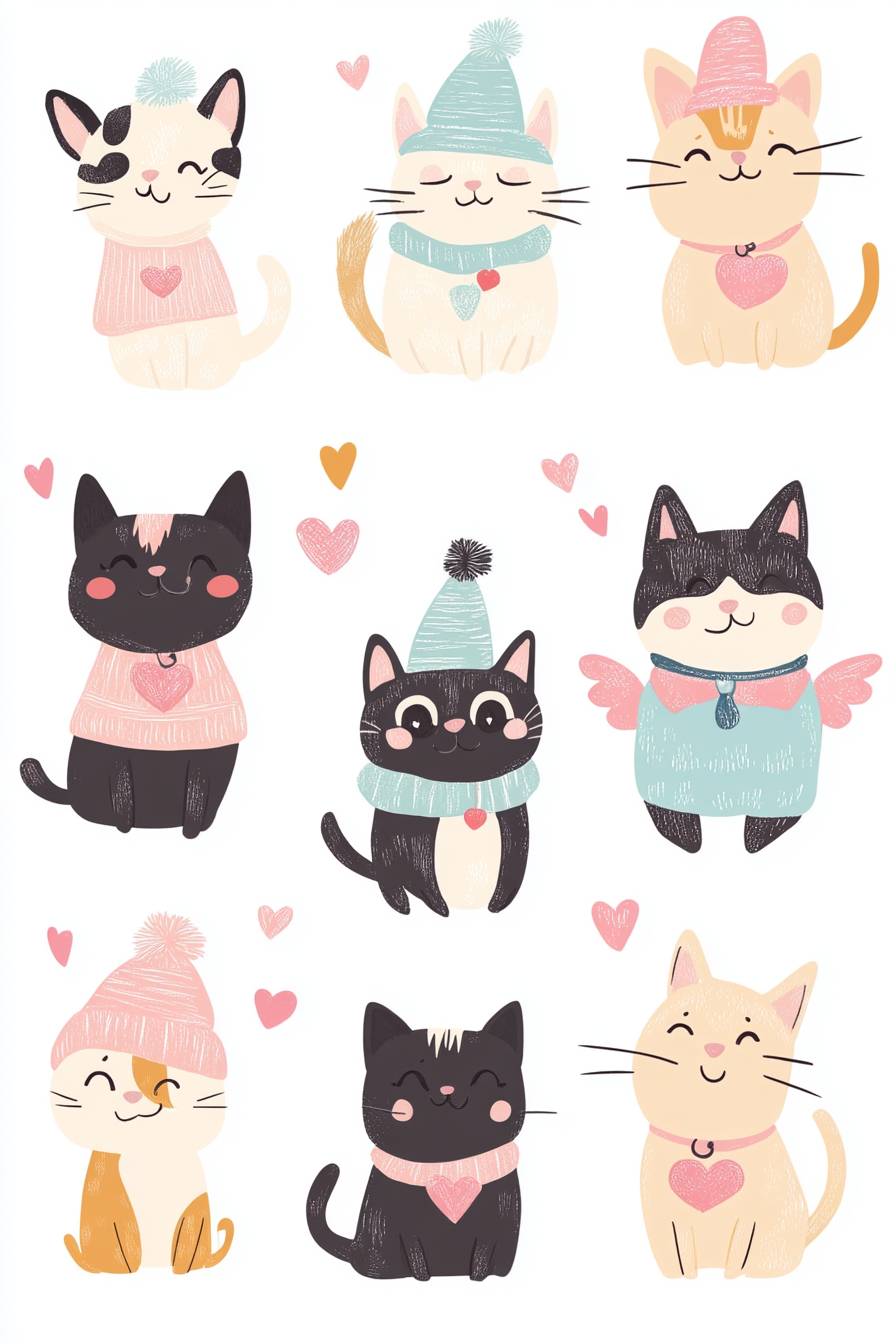 Cute cartoon vector illustrations of different animal characters, dressed in cute costumes and hats with various expressions on their faces. The background is white. There should be nine patterns arranged from top to bottom left to right. They include one dog wearing pink with heart-shaped decorations; two black cats in adorable outfits with hearts around them; three super fat beige dogs with small wings; five chubby kittens wearing blue ; one yellow cat --v 6.1 --ar 2:3