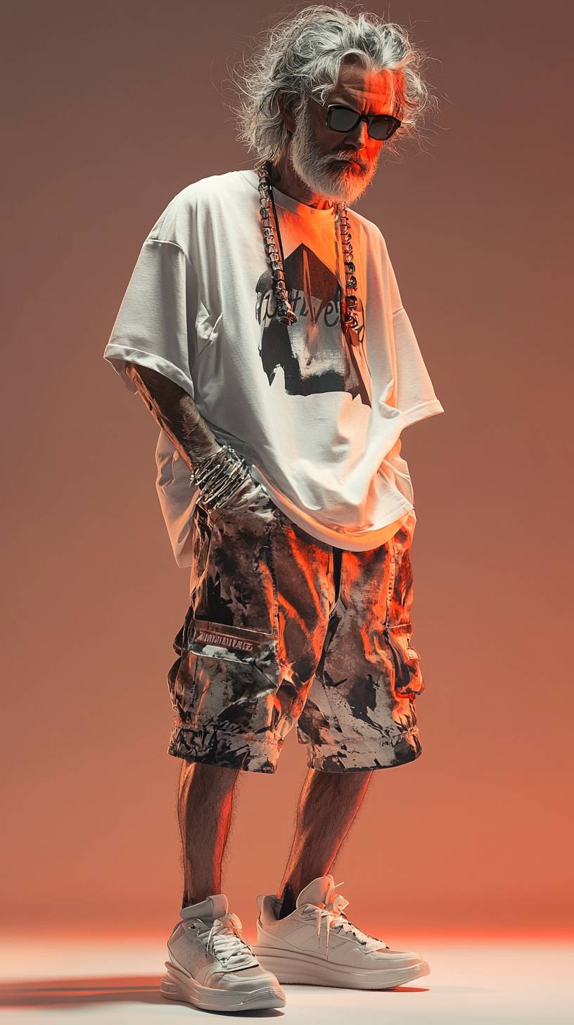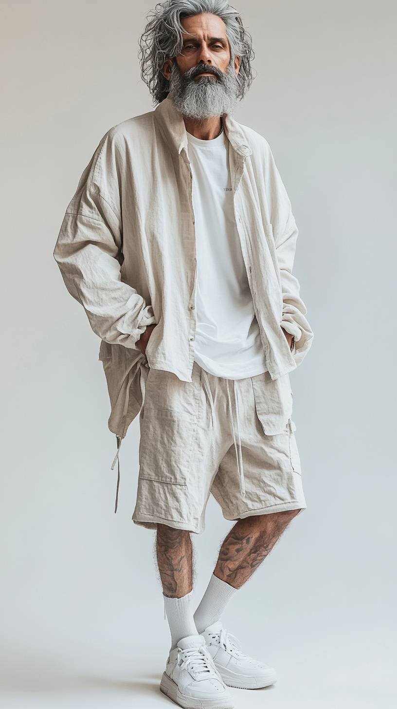 a hyper detailed stylish middle age 38 year old expressive male silver grey gradient hair , stylish and messy , and beard, model is wearing a oversized t shirt with matching crop sweatshorts in earth tones tones and neon, posing for the camera in a full-body shot, editorial photography, esquire photoshoot, anime inspired, standing cool pose, minimalistic background with neutral tones, white sneakers, palette, soft lighting, highly detailed, high resolution. --ar 9:16 --stylize 250 --v 6.1