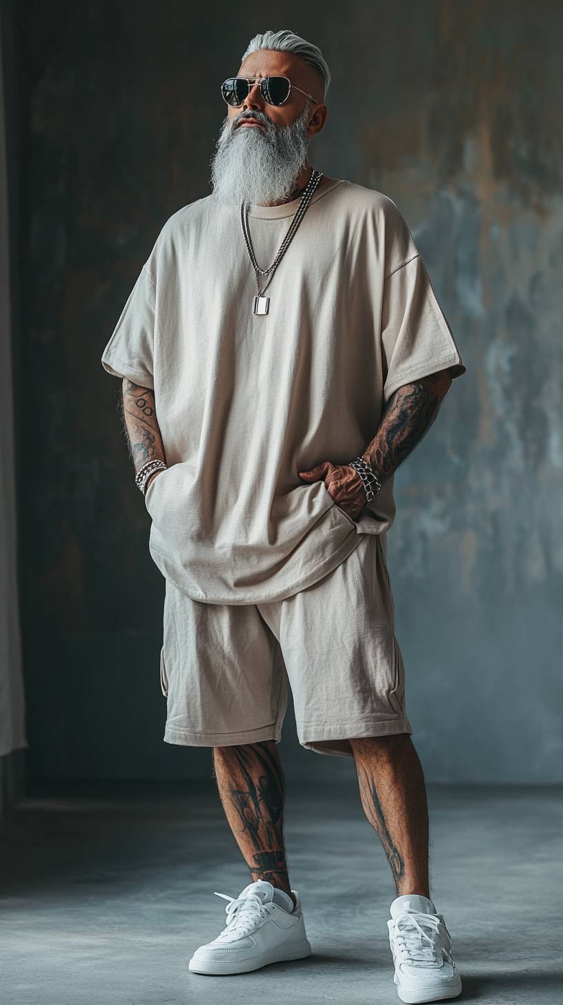 A 38-year-old male model with silver grey gradient hair in a stylish pose, wearing oversized t-shirt and matching shorts.