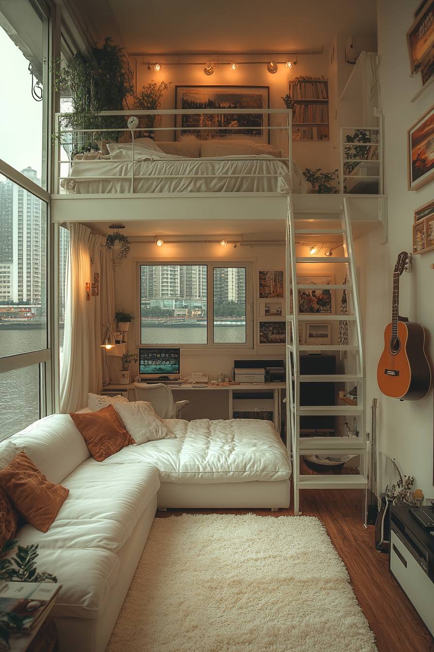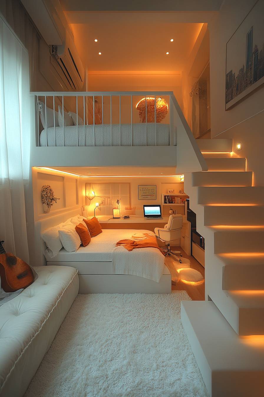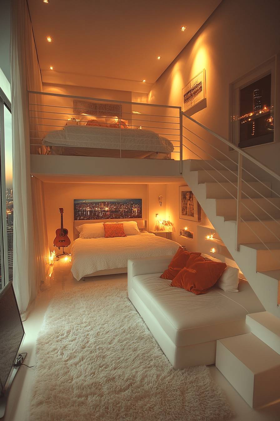 A small white duplex in the dark night.stairs. Warm mood lighting, a staircase with handrails leading to the second floor, where there is a comfortable white bed with a fence. The first floor has a white plush sofa, white plush carpet, a computer on the computer desk, an ergonomic chair, a guitar hanging on the wall, and a view of the Chinese city from the window. The whole room exudes a peaceful and serene atmosphere. Realistic photography style, detailed textures. --ar 2:3 --stylize 750 --v 6.1