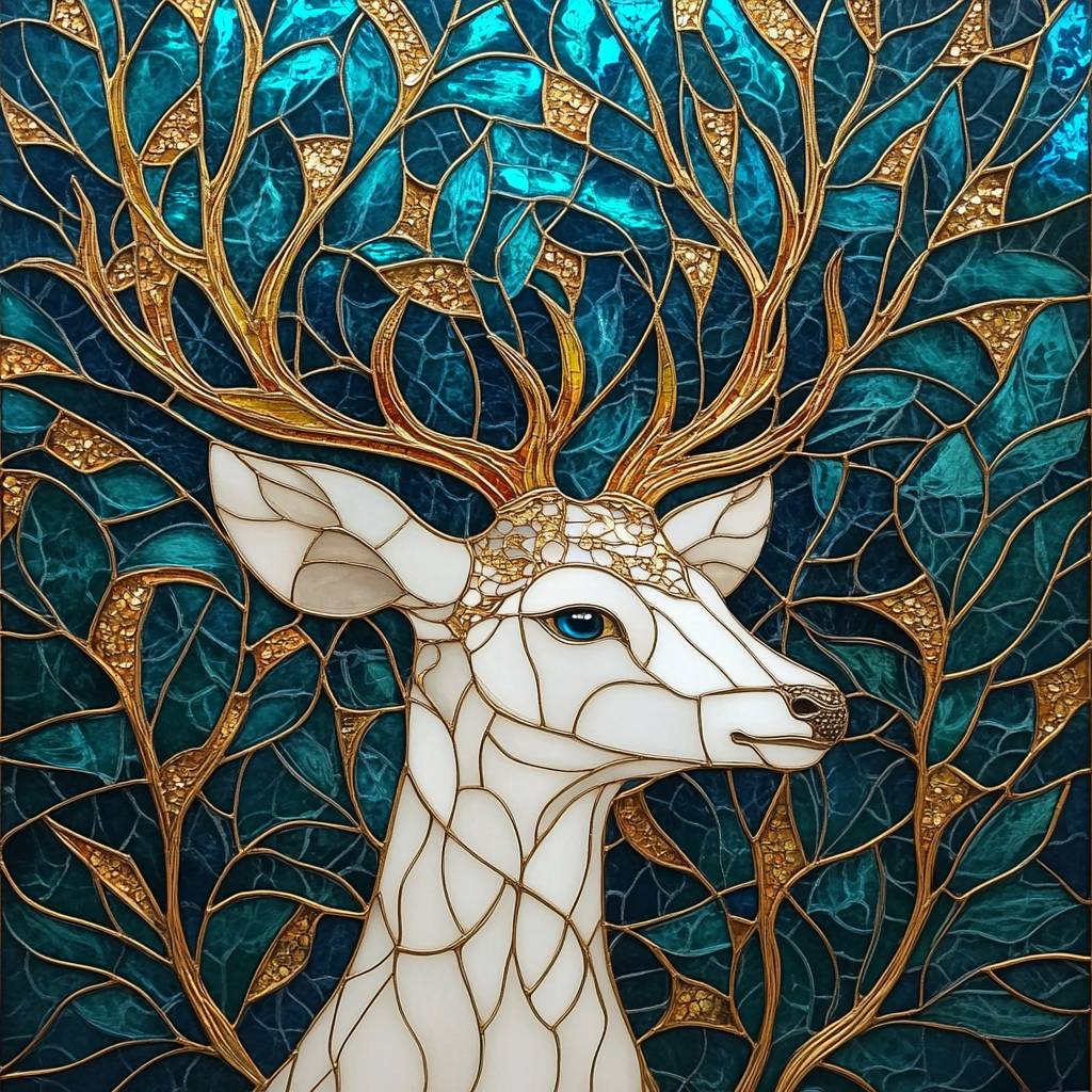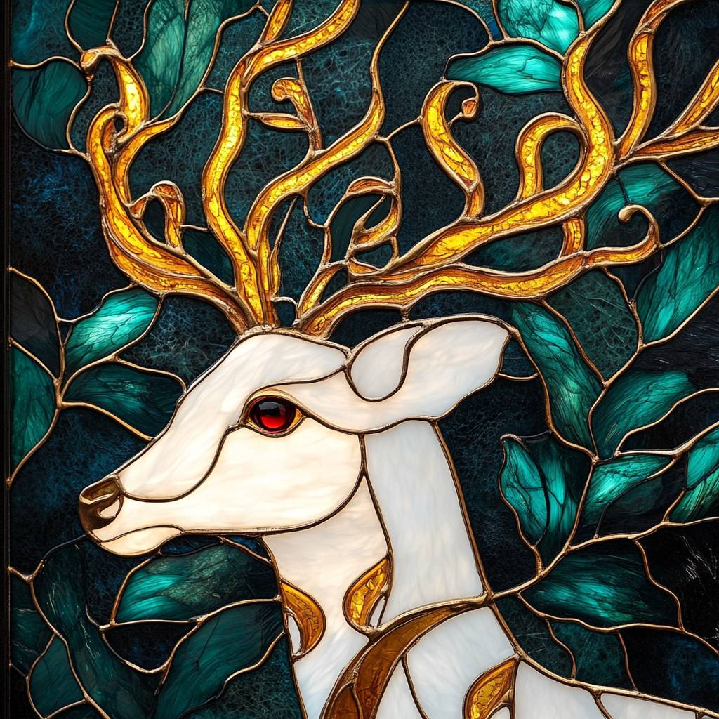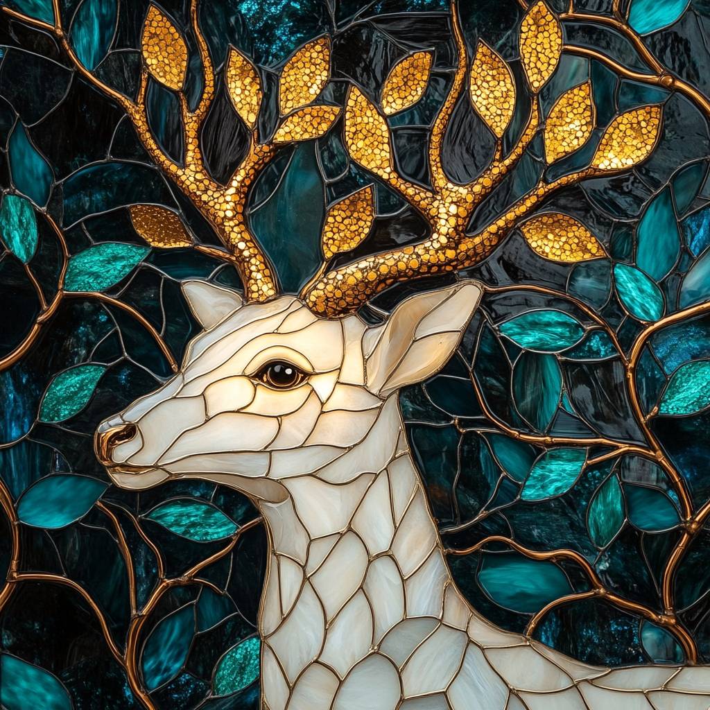 Gaddafi-style stained glass featuring a white deer with golden antlers and teal leaves, an elegant and stunning masterpiece.