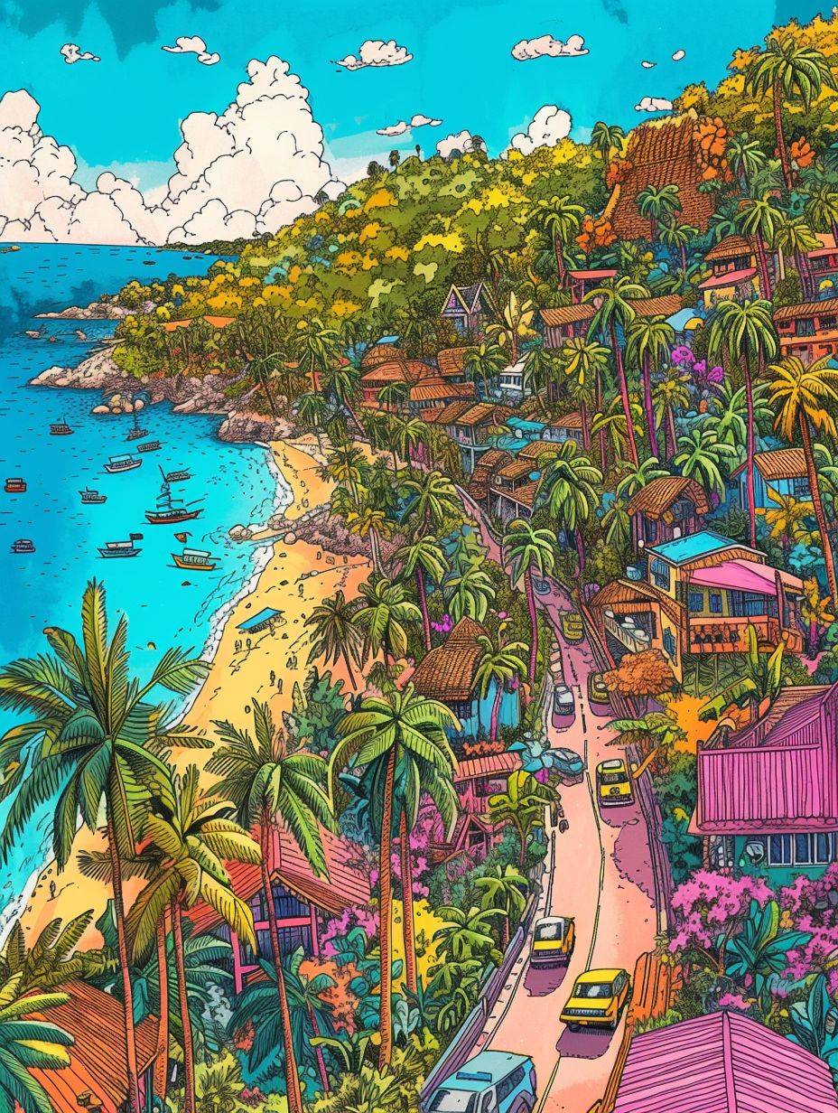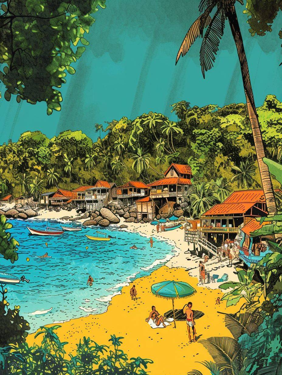 detailed pen and ink illustration of Boracay Island, by Herge, in the style of tin-tin comics, vibrant colors, detailed, sunny day --ar 3:4 --v 6