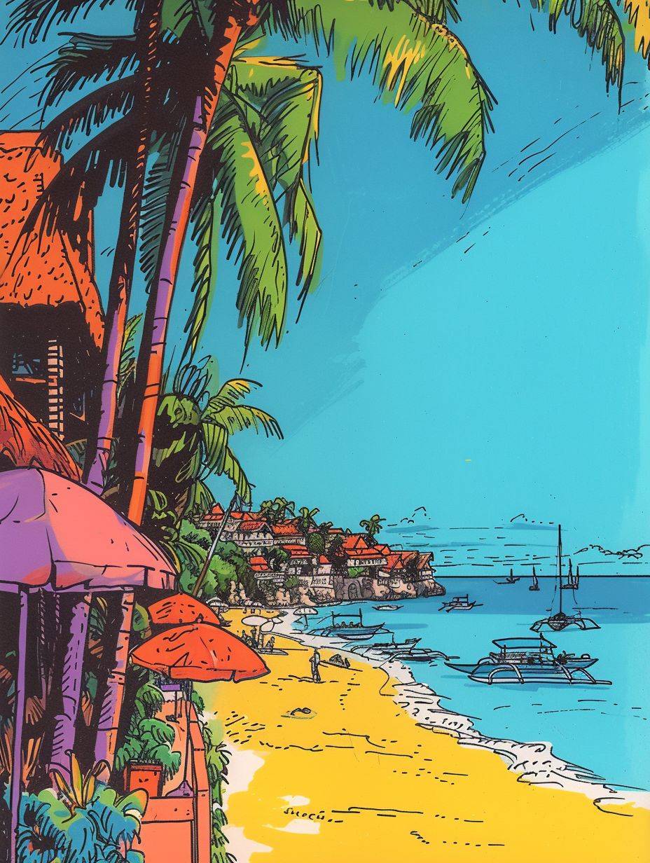 A detailed pen and ink illustration of Boracay Island in tin-tin comic style on a sunny day.