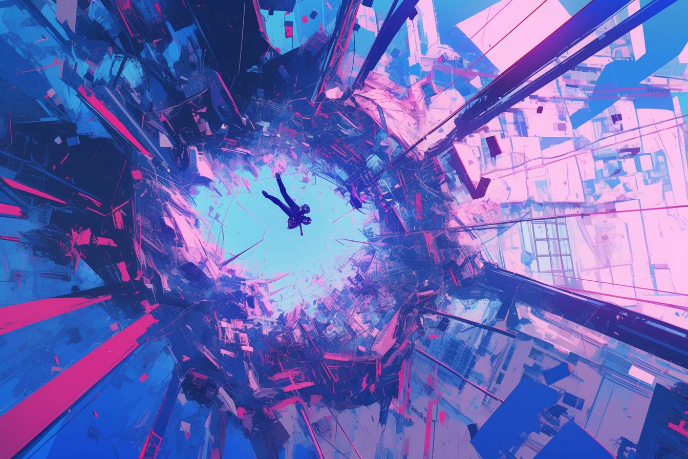 A hypercompressed frame grab of the subject frozen in datamosh ruins, with chaotic motion stutter from tearing lines and crushed bitrate.