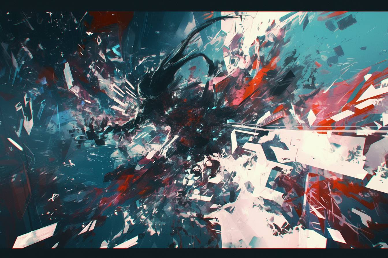 A Hypercompressed Frame Grab of [SUBJECT], frozen in datamosh ruins, with [COLOR1] tearing lines and crushed [COLOR2] bitrate creating chaotic motion stutter --ar 3:2 --niji 6