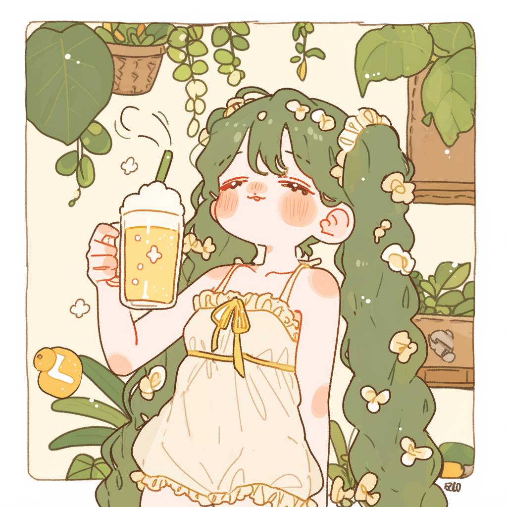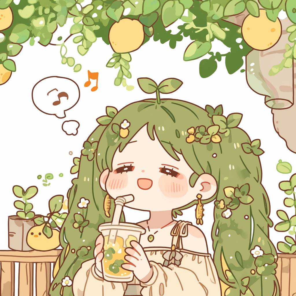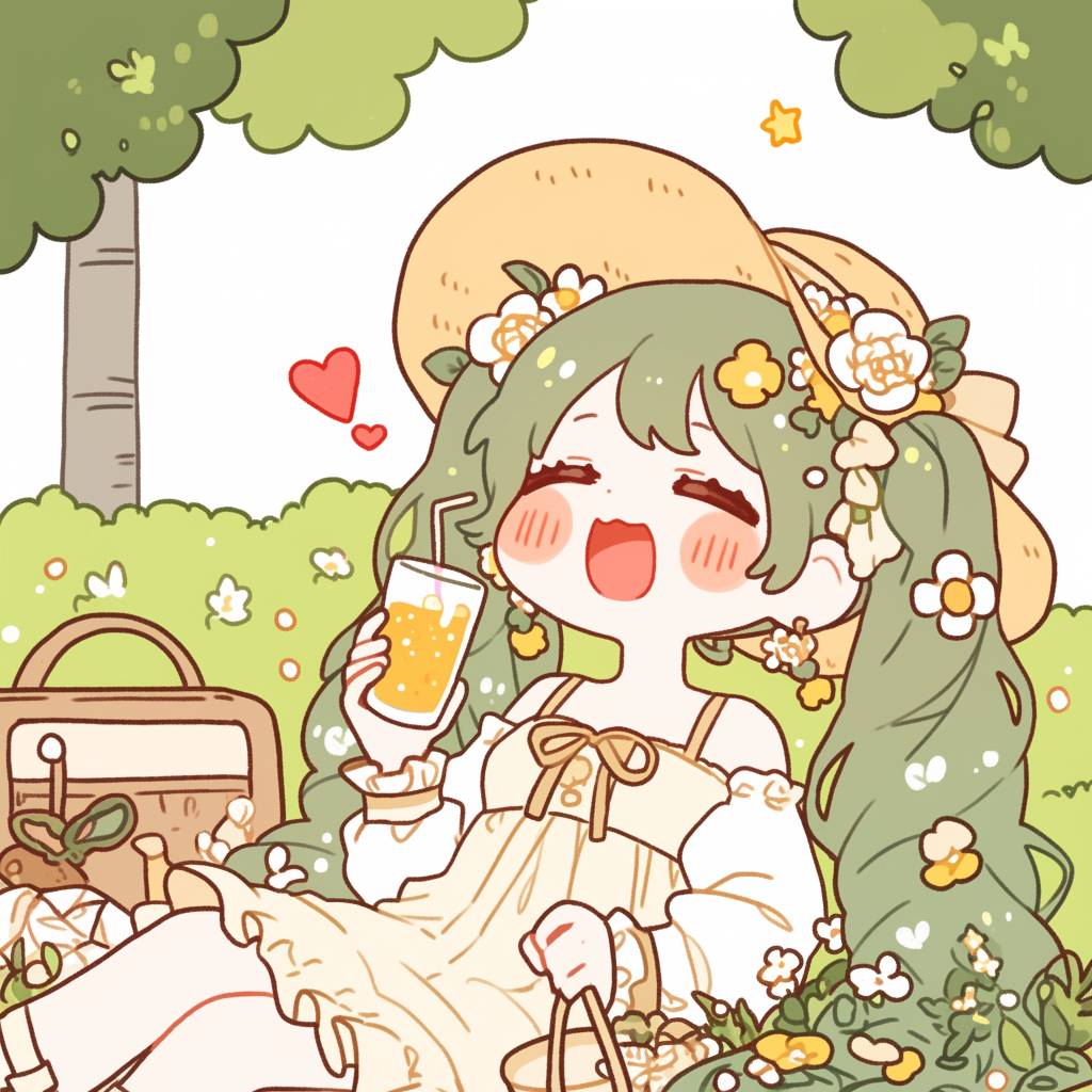 Hatsune Miku, white dress, glass with juice, beautiful garden, clear beautiful sky, hand-drawn style, illustration, art by Mika Pikazo. --sref 2383886261 --niji 6 --sw 500 --stylize 400 --profile zyh6235