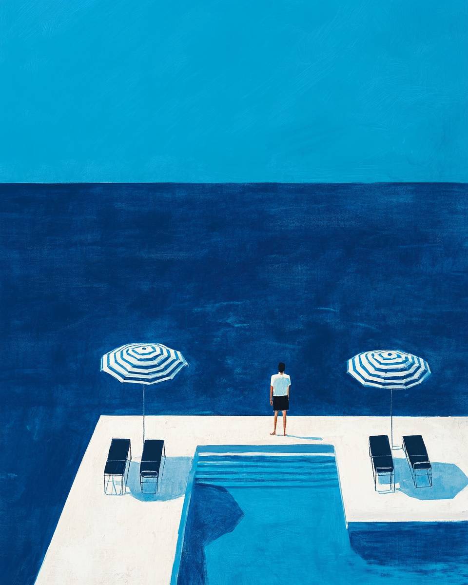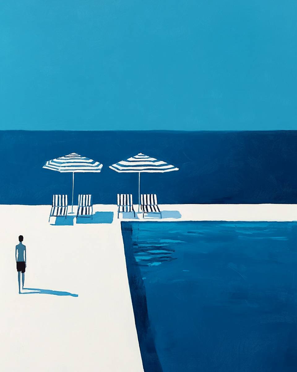 A minimalist painting shows a blue and white swimming pool with sun loungers and a person in black shorts looking at the water.