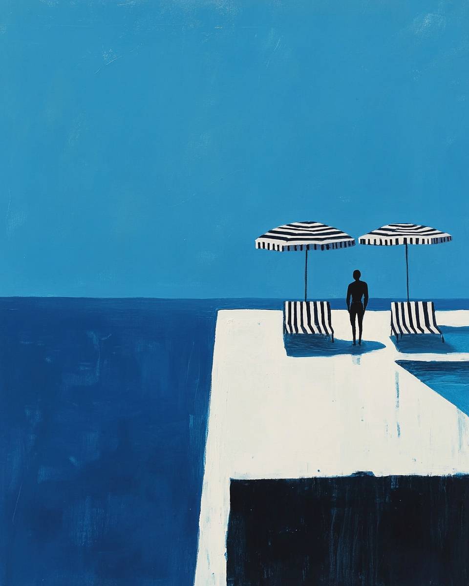 A minimalist painting with bright blue and white tones depicting an old-fashioned swimming pool in the foreground, with two sun lounger chairs under striped umbrellas on top of it. A person stands at one end wearing black shorts, looking out over the water. The background is a flat, deep sea-blue. Inspired by the paintings, flat perspective, and natural lighting of James Welling. --ar 4:5 --iw 3 --v 6.1